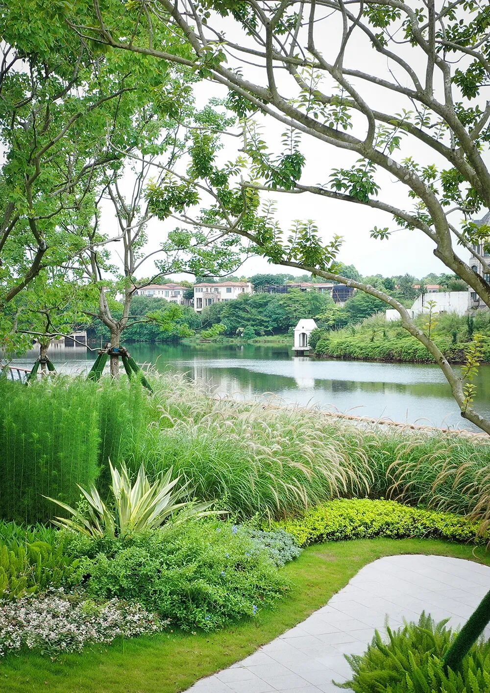 美的山水半岛屿庄园项目设计以湖为主体,风作载体,通过现代流畅的曲线和承、转、启、合的设计手法,将现代湖居生活方式重塑于场地中,保留湖最原始的状态,将人与湖的联系,用设计去还原,以景观来演绎。设计营造了一处半开敞的景观空间,一边是需要适当私密性遮挡的私家别墅,一边是具有极高观赏价值的自然湖景,打造人性化的居住环境。