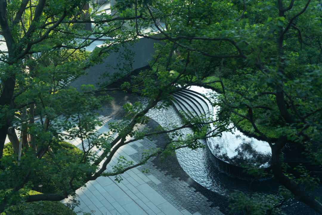 大门处潺潺流水与周遭环境相辅相成,自然与艺术的交织。