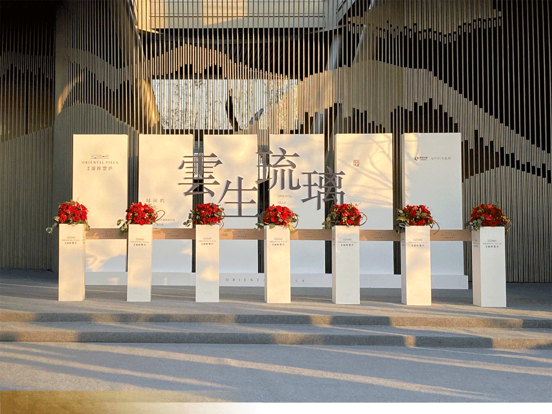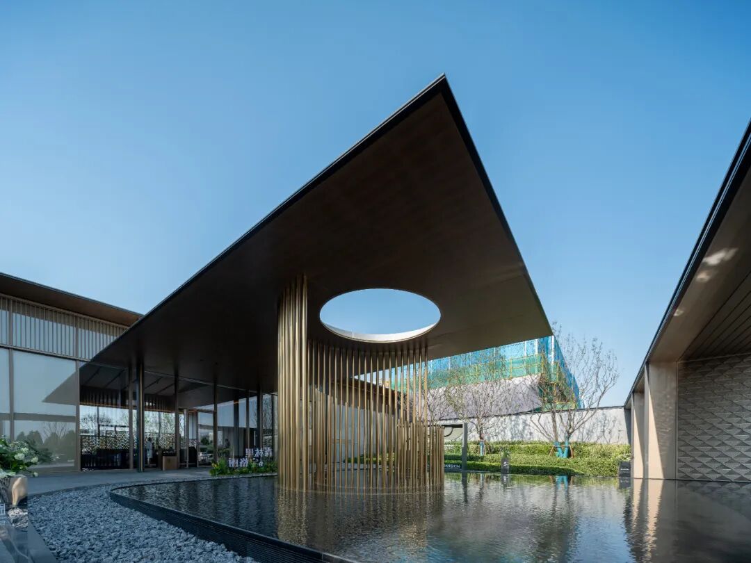 在美学馆入口处所设置的仪式景观,因其顶部造型,光线像是从圆形开口处沉下来,故得名“沉光”,与格栅上的山水纹和祥云纹,以及主元素“追风”相呼应,得以形成“沉光出云湖烟生,追风随心结庐居”的美好之境。