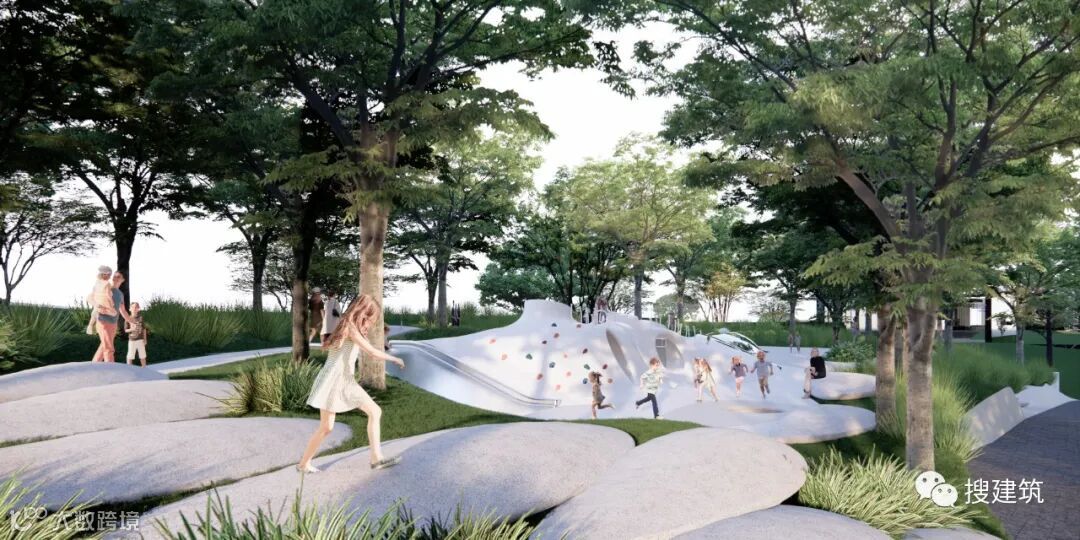 在中原首创约5米高落差的山水格局,起伏的地形上,引入山与湖泊,映照外界的山水,构建潜山之径、山谷画廊、趣味之丘等主题景观区,缓缓展开一幕幕绿影间的生活场景,形成更具深意与层次的多元空间。