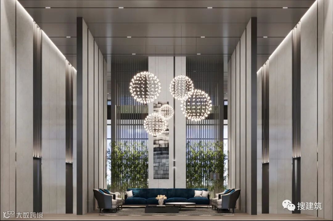 归家大堂首层到三层全架空设计,以挑高9米的尺度,李玮珉执笔的美学思考,打造中原挑高最高、空间最大的豪装酒店式入户大堂。