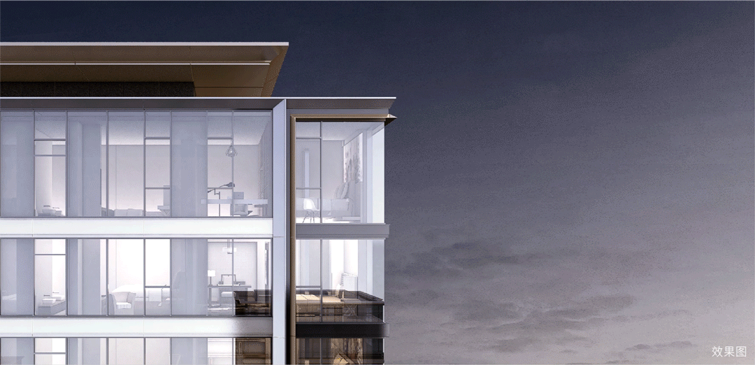 项目外立面采用经典的三段式构造,体块明亮,凸显顶部庄重,同时使用大量的金属装饰板,使立面更加醒目。主体采用暖色深浅搭配,简洁的线条压顶,产生舒适的延伸感。底层基座重点强化,使建筑在视觉上整体更加稳重。
