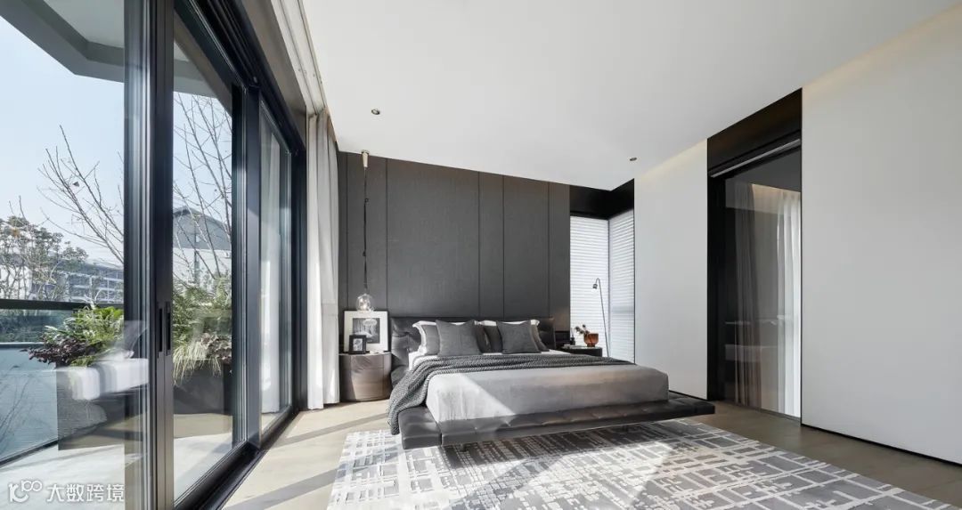 外立面黑白灰高阶三层三色轻盈时尚。墙体延面、阳台错落、坡屋顶、三次视觉暂停。基底灰色石材+顶层金属铝板+定制系统门窗,极具美感的25º坡屋顶,最大处约6-7米挑高,50%以上落地玻璃,无数精致细节拼接出独具匠心的美学。