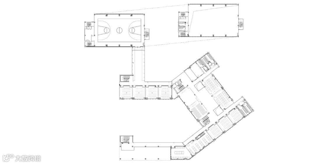 教学楼体块一分为二,平行围合形成中央庭院,充分满足36班教室的南向日照,外部增设立面遮罩,丰富建筑形体的视觉效果。两栋主体教学楼之间设置实验楼,并采用玻璃屋顶保证实验楼中庭采光,不规则连廊联通两侧后使得空间集中、有活力。