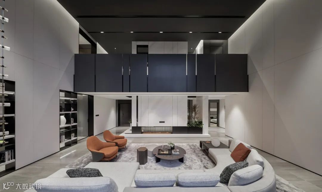 为了在空间内部营造同样通透的视野,客厅采用玻璃幕全落地设计,长达16米的连续玻璃幕墙,单块面积达4㎡的双中空low-e玻璃,270°巨幅景观视野,让客厅向外的视觉效果达到最佳。