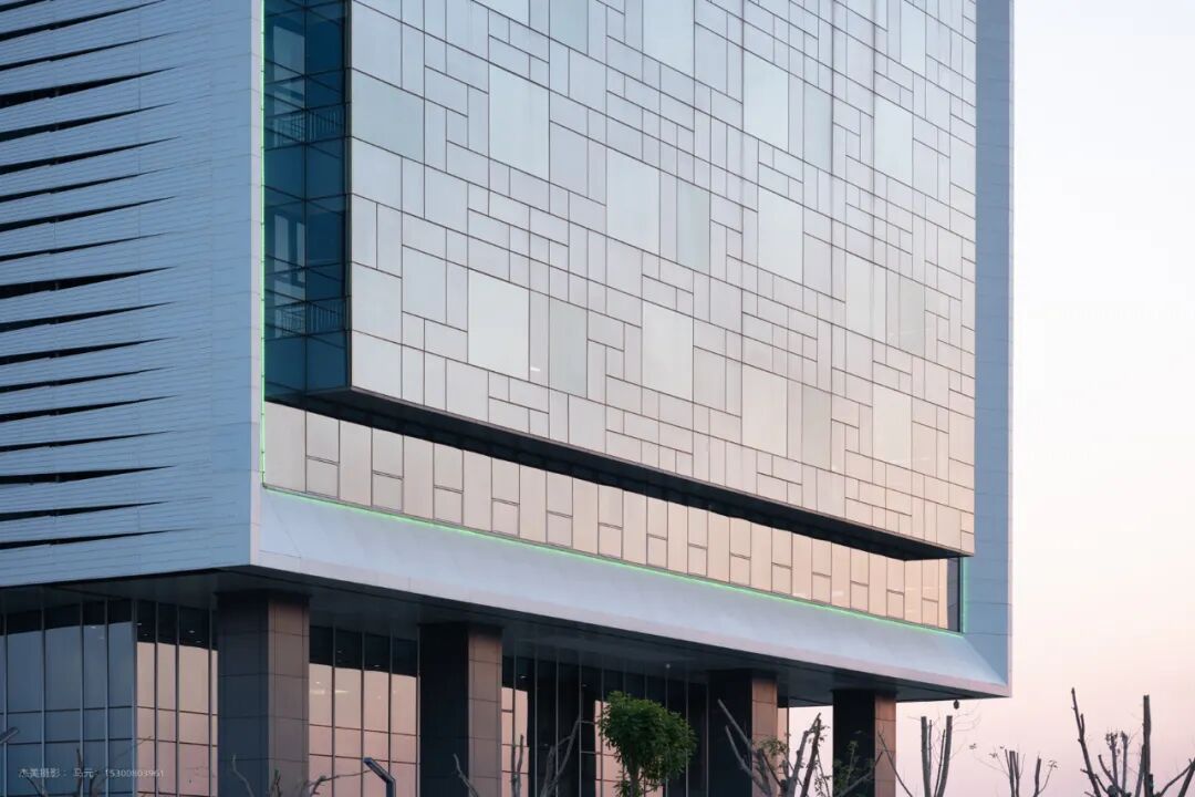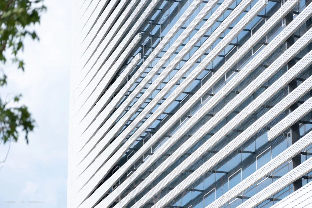 立面设计延续纽带概念,内层幕墙为全玻璃幕墙。外层幕墙为横向穿孔铝板百叶,外形大气现代、富有科技感。解决玻璃幕墙的遮阳问题的同时在人视点高度位置做变化处理,以达到通畅观景需求。