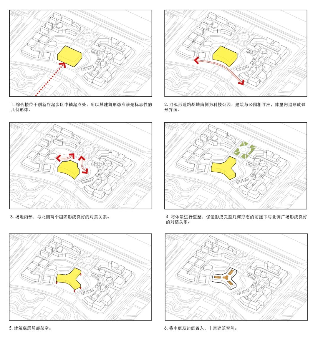 综合楼采用完整的风车状几何形体,突出其作为起步区南北轴线起点的标志性。建筑因借其功能复合性,形成丰富的空间形态。