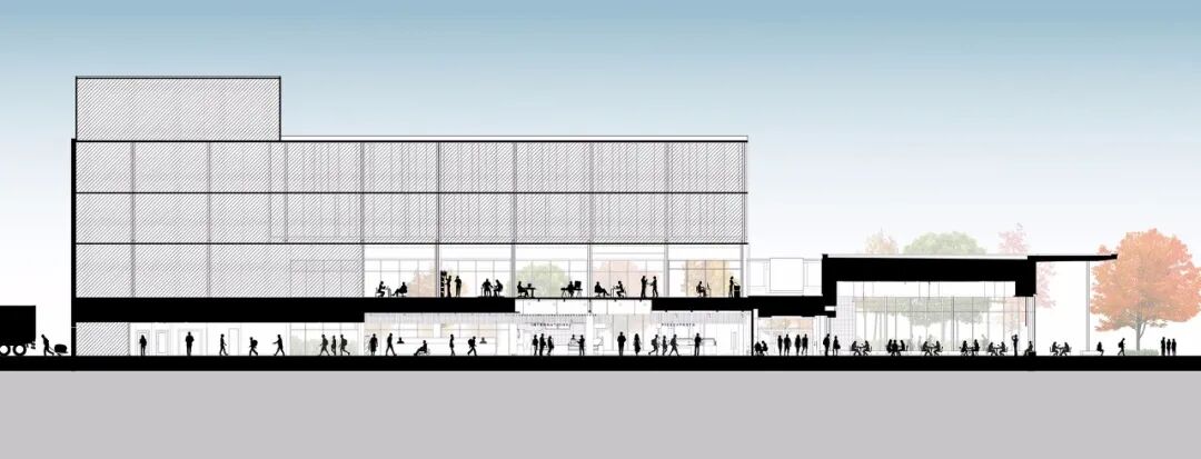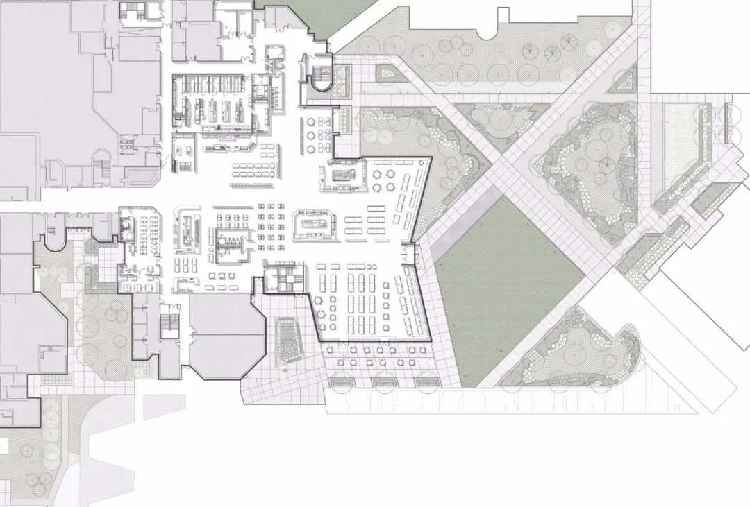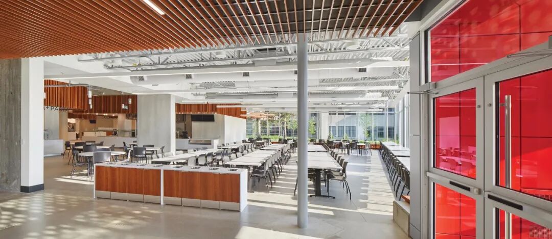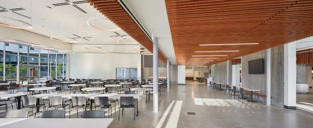 现有的校园由一系列建筑组成,这些建筑由一条公共走廊相连,最初终止于一个传统的学生食堂。泰勒·史密斯 (Taylor Smyth) 将走廊改道穿过旧的自助餐厅,打造出一条充满活力的步行街,两旁设有食品站、各种灵活的座位选择、长椅和灵活的公共聚会空间,这些空间也可作为艺术表演、街头艺人、艺术表演的小型活动空间展品等。