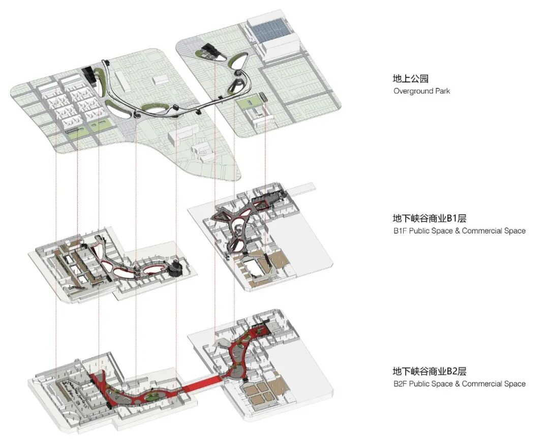 地面上设置了六个“峡谷洞口”,使公共绿地与商业空间互为风景。洞口的曲线自然流畅,结合满是绿意的台地过渡到商业的共享空间,从而模糊了地上与地下的界限。