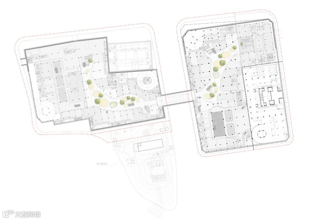 另一个重要的入口则是通过新建的四层裙房进入地下商业空间,巨构尺度的门户限定了绿地与商业。其水平向线条和合宜的建筑材料,将其与塔楼和这片区域开发的建筑群在美学上统一起来。