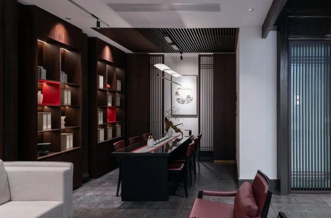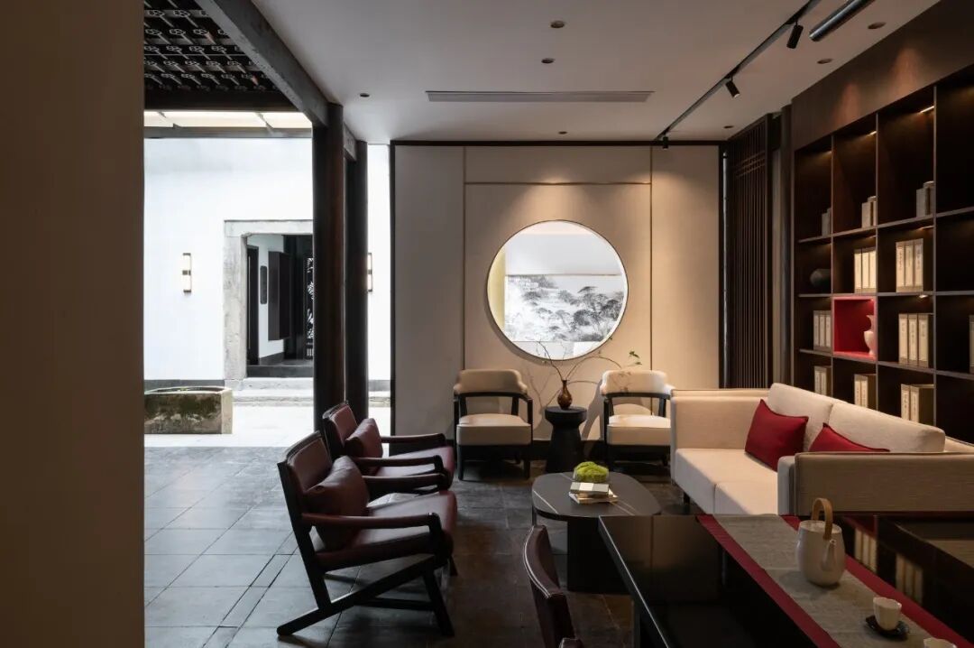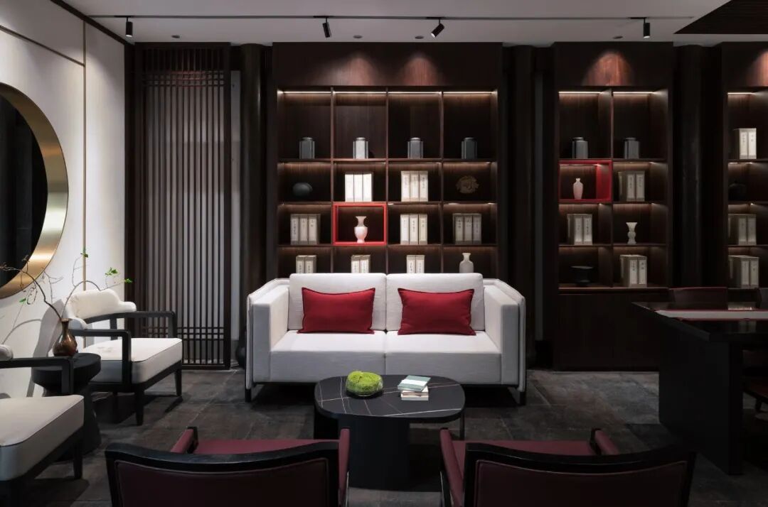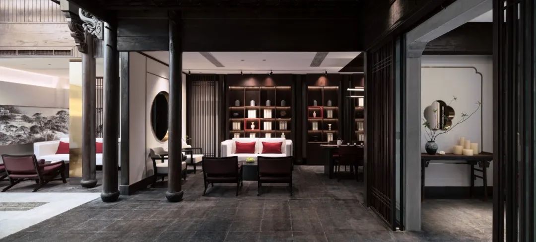 The front hall of the hotel is set in the fourth courtyard of the ancient house where the east-west and north-south axes meet. The transformation of the ancient house is a dialogue with history, and the guests returning home naturally switch from the rhythm of the city outside to the tranquil and natural atmosphere of the garden. In the design of the front hall, we emphasize the natural texture, using natural materials such as walnut wood and natural stone, faithful to the real texture of the material itself, and continuing the natural and mellow atmosphere. In terms of furniture form, the simple and pure modern language has been removed from the original space. It subtly coexists with the dark wood in the interior of the original building, and has a relaxed and comfortable modern atmosphere. In the key parts, it is embellished with deep lacquer red, so that the new and the old have their own clear logic, and they are reborn harmoniously in the contrast and collision.