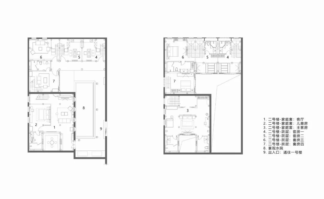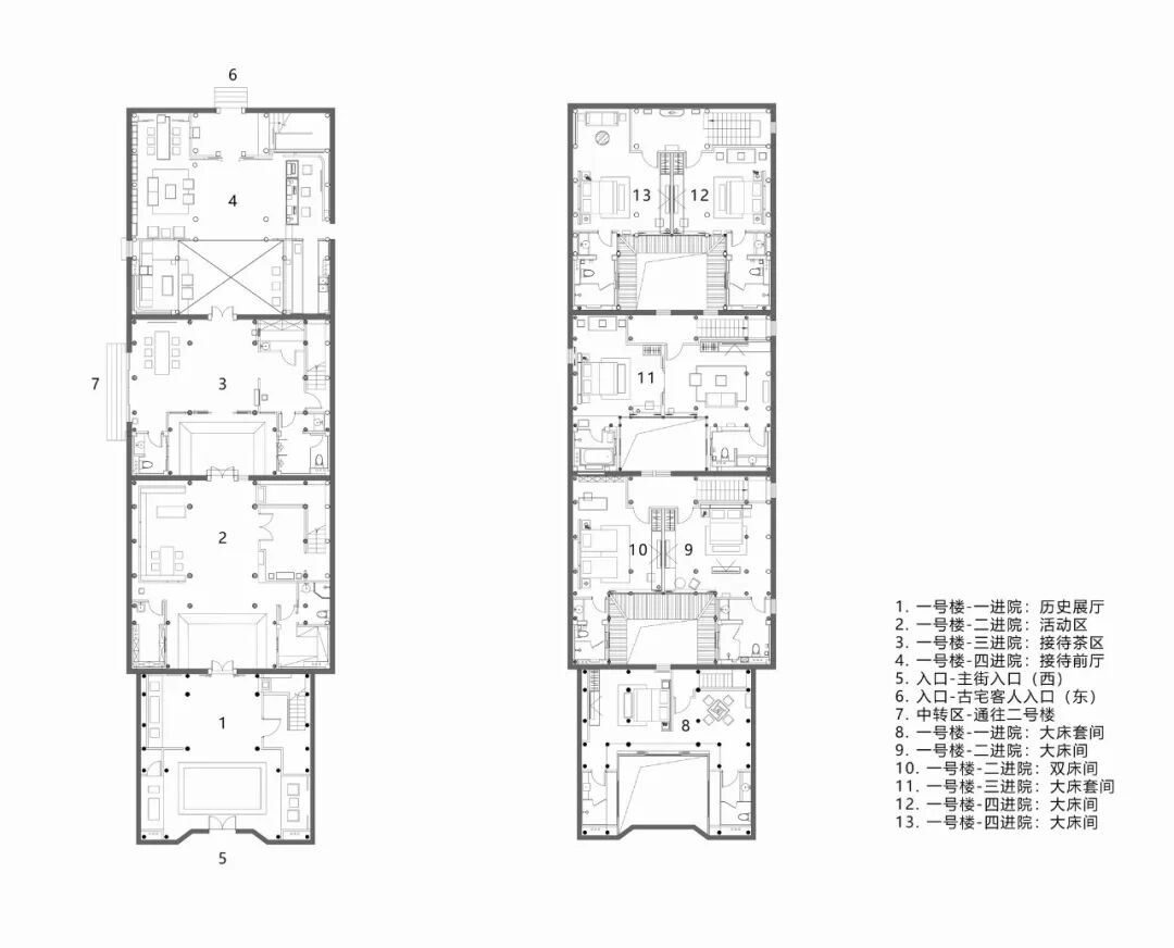 整体的功能沿着北侧入口展开,进入后可以见南北向轴线长廊,转向东西一明一暗,一新一旧对称递进的同时,完成公共向私密的过渡和转化。北合院为独立合院,从一号楼的三进院侧出,经过户外水庭,即可去到一间两层套房;北院东侧有四间客用阁楼厢房。此院与前四进院的二楼七间客房均原生空间形态,嵌插置入家具屏隔,构筑起客房起居场域。东合院三号楼为新起的仿古立建筑,复建时的内部框架格局均以酒店式隔间成形了。三号楼在客群上更偏向商务接待,因此在内部空间上也有意与前院形成反差,使用简洁而纯粹的现代语言,以浅色细木作板壁,采用白腊原木色家具,与古代建筑室内的深色形成对比,简洁明朗的酒店氛围表达。新与旧有着各自清晰的逻辑,在对比和碰撞中和谐共存。