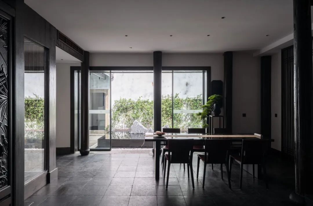 酒店的前厅设置在东西与南北两条轴线交汇的古宅第四进院。古宅的改造是一种与历史的对话,回家的客人从外面的城市节奏自然地转换到园林宁静自然的氛围里。在前厅的设计上我们强调自然的质地,材质上采用胡桃木材、天然石材等自然材质,忠实于材料本身真实的质感,延续自然醇厚的氛围。家具形态上,则去除了原先空间固有的古朴符号,简洁而纯粹的现代语言。与原有建筑室内的深色木质微妙共生,更具有轻松舒适的现代气息。在关键的部位,点缀以深邃的大漆红色,让新与旧有着各自清晰的逻辑,在对比和碰撞中和谐新生。
