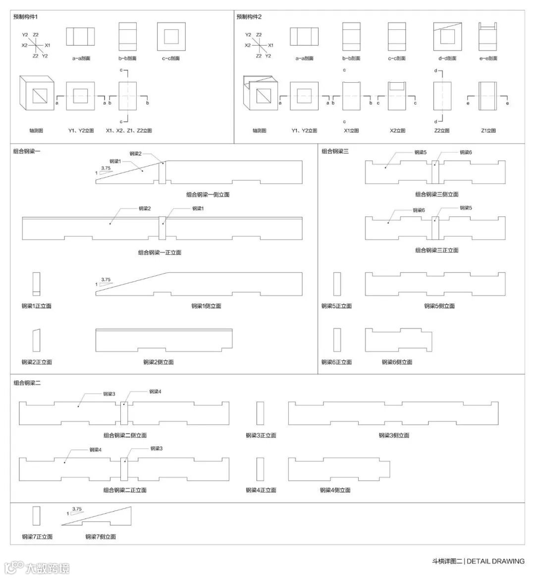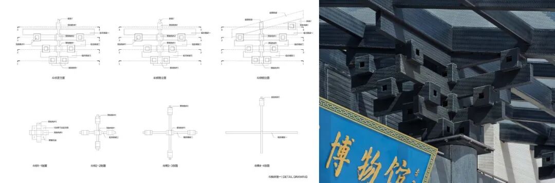 日本建筑大师对斗栱形式的提炼早已闻名于世,采用单一类型构件叠合的手法充分体现了日本文化所追求的洗练和极致。三馆在斗栱的设计中探索了另外的方式,继续坚持“二元论”,把“斗”和“栱”进行各自独立的提炼,再按照传统逻辑进行组合。最终完成的钢结构柱头介于抽象与具象之间,保持了传统斗栱的构成关系。