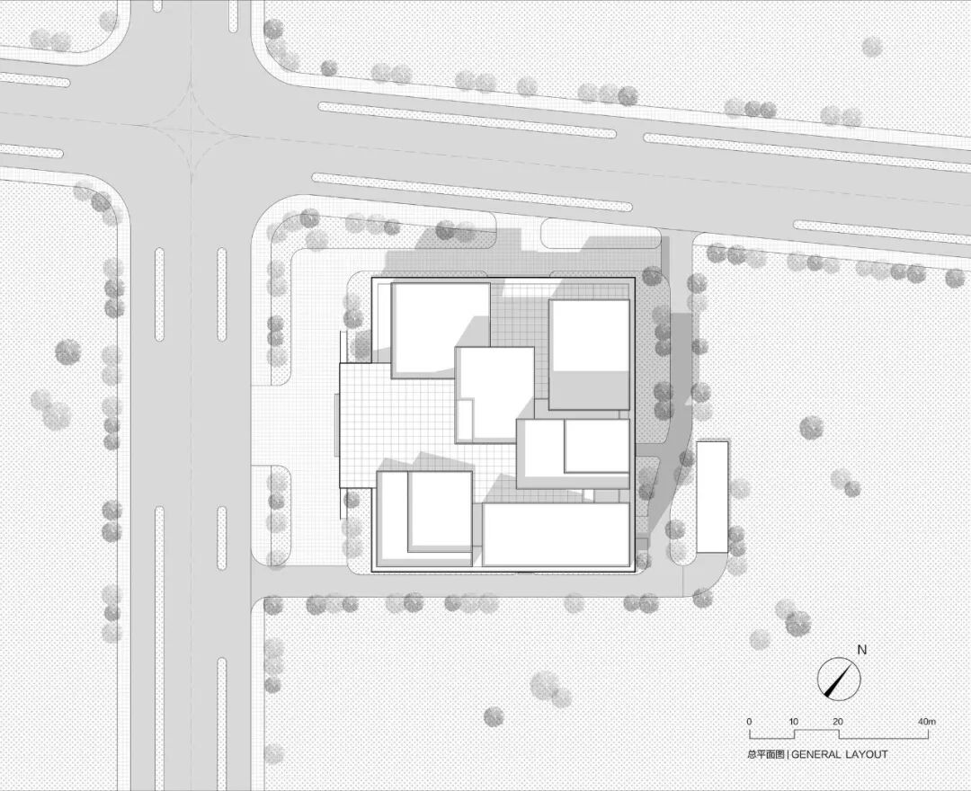 嵩县三馆合一建设项目位于伊河对岸的新城。在不足9000㎡的基地上,承载了博物馆、档案馆和规划馆等主要功能,地上建筑面积1万㎡,容积率高达1.14,对于文化建筑来说用地极为局促。同时这幢建筑又是县内第一座综合性文化设施,发挥着保存、展示嵩县的历史记忆与未来愿景的重要作用。