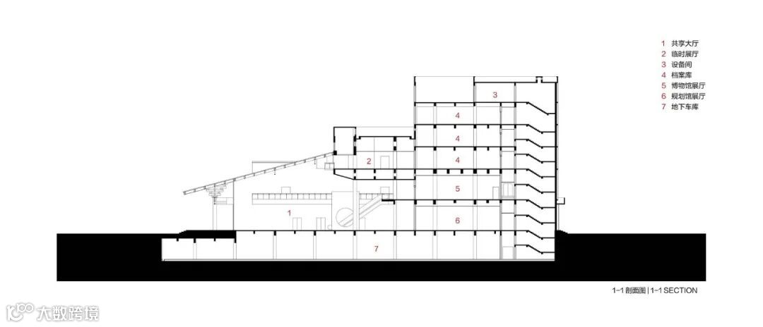 设计中将“山”与“水”的二元关系与体量的虚实、空间的开合、功能逻辑等整合考虑,运用几何形体的组合获得一种较为抽象的表达。博物馆、档案馆等功能空间在外部构成了“山岳”,公共空间的玻璃顶如溪流从山体间奔涌而下,在两个方向分别覆盖了共享大厅与档案馆门厅。