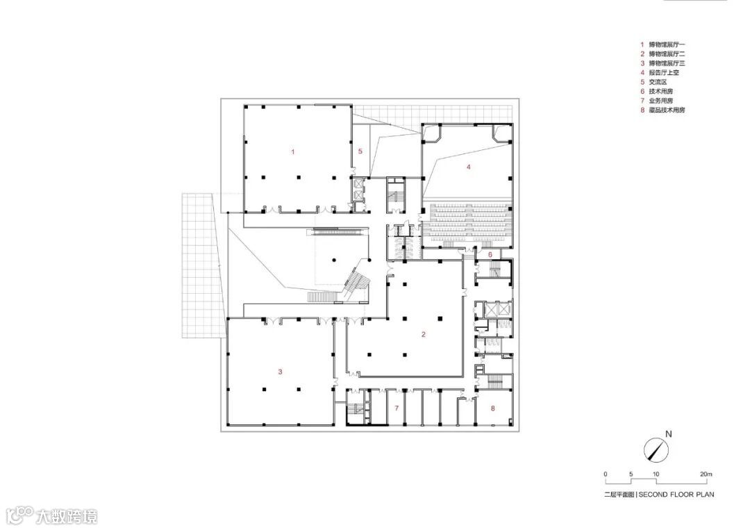 要在1万平米的容量内容纳博物馆、档案馆、规划馆和会议厅等多种空间,三馆的平面设计非常紧凑,公共空间以及楼梯、电梯、卫生间等尽可能共享使用;人流量大的规划馆布置在底层,2-3层为博物馆,二者围绕共享大厅布置;3-5层为开放度较低的档案馆,在西北侧有独立的门厅,会议人流使用档案馆门厅,避免与公众人流相互干扰。