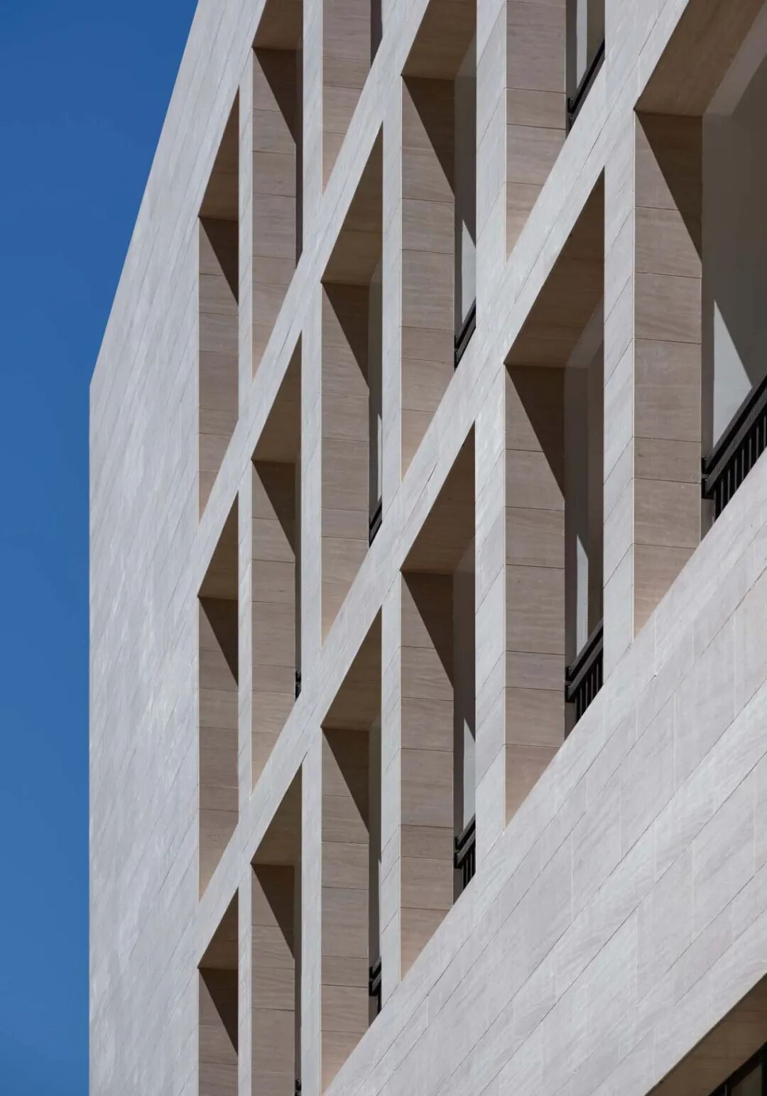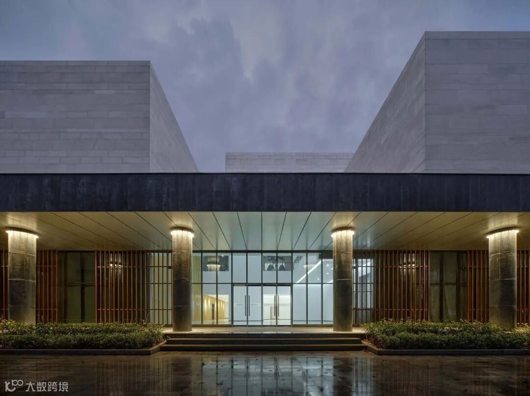 Realistic Issue of Material and Structure. The surface of the upper volume is made of light-colored limestone, while the gable and colonnade on the ground floor are made of dark granite. The limestone slabs are used in three different sizes to reinforce the overall horizontality and the natural appearance. Efforts were also made in the structural design, such as using concrete-filled steel tubular columns and Beam String Structure to obtain a light and graceful vision.
