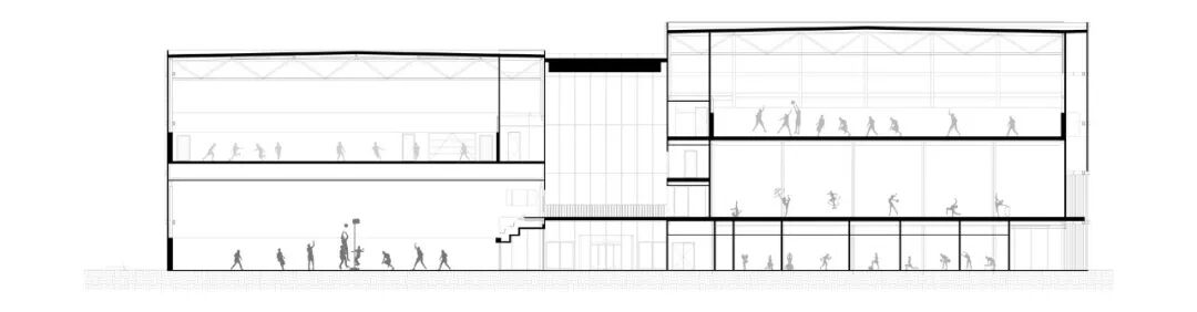 建筑群略微弯曲的东面立面以全高的玻璃角打开。另外,中央通道的两端都是纯玻璃的。当然,这种透明性最大限度地增加了视野,实现了室内外的平滑过渡,并允许日光进入;它也标志着热闹的地点:公共功能,在街道层面和上面,加上不需要封闭大厅的体育活动。