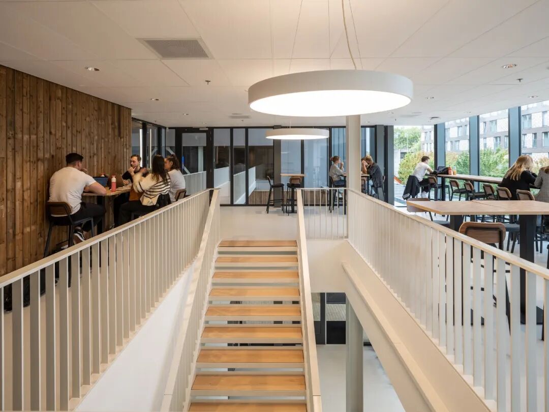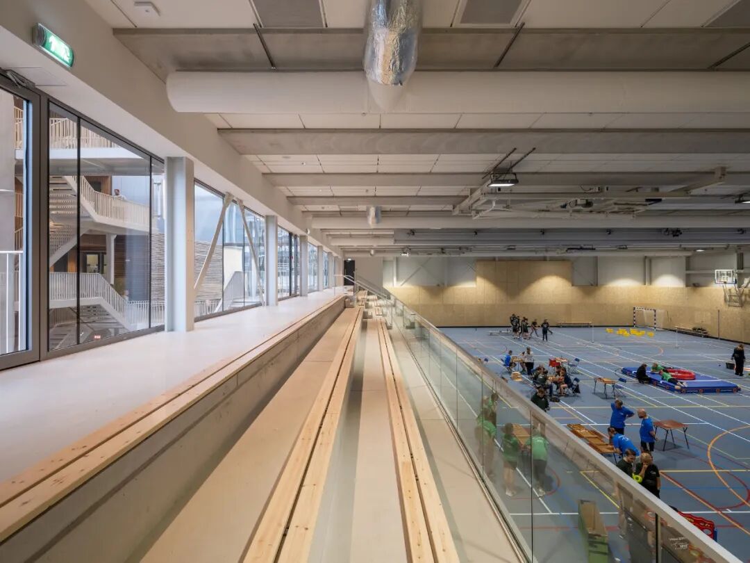 Energy-neutral sports complex by VenhoevenCS for Erasmus University. Sports Building on Campus Woudestein Rotterdam opened. Sports Building stimulates social and healthy student life at campus Woudestein of Erasmus University Rotterdam. VenhoevenCS architecture+urbanism designed this sports complex to accommodate over fifty sports by stacking the sports hall on a compact plot. The complex functions are energy-neutral and the lively public interior is fashioned from circularly harvested, re-used materials. The central axis through the building functions as destination and transit at the same time and is a true physical and social connector. Sports Building was officially opened this fall.