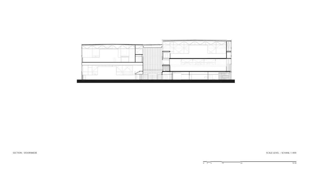 这个公共区域将功能、运动和运动员以及校园的两边联系起来。"内街真的是一个真正的物理和社会连接器;光线充足,高度较高,有楼梯和人行道,有很多绿色植物,当然还有一个酒吧。从这里看,所有这些爱运动的学生的景色真的鼓励人们参与进来"。 - 曼弗雷德-万辛克,建筑师,以及合伙人-董事VenhoevenCS。透明度和韵律。体育大厦由玻璃和铝皮包裹,水平衔接和垂直鳍状物的相互作用形成了多种节奏。