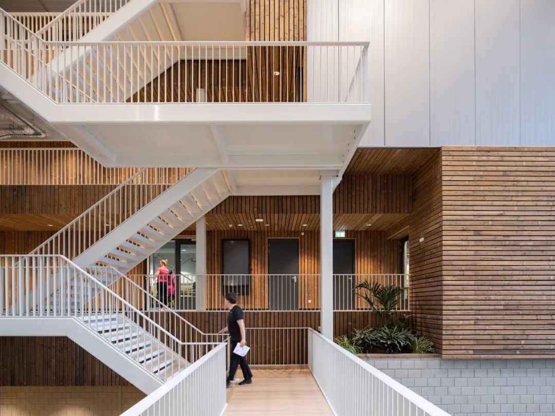 例如,泽斯特(荷兰)的一个前青少年拘留中心的金属板再次发挥了天花板的作用,我们让埃因霍温技术大学馆的1100平方米的木地板获得了新的生命,成为内街的外墙板。通过强调这种再利用,我们的目的是让社会参与并激励这个学生群体为循环经济作出贡献。