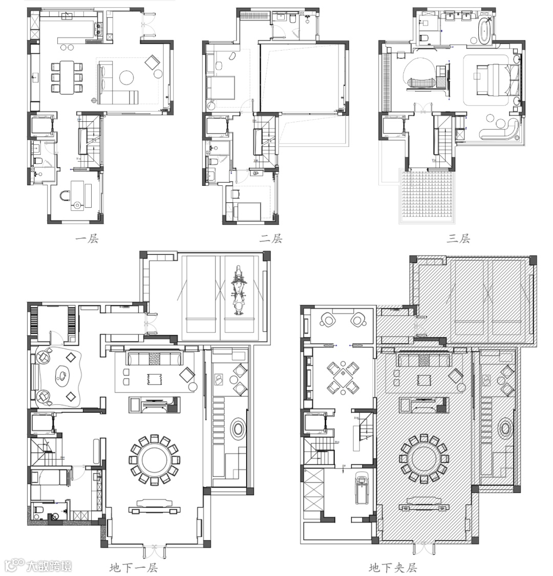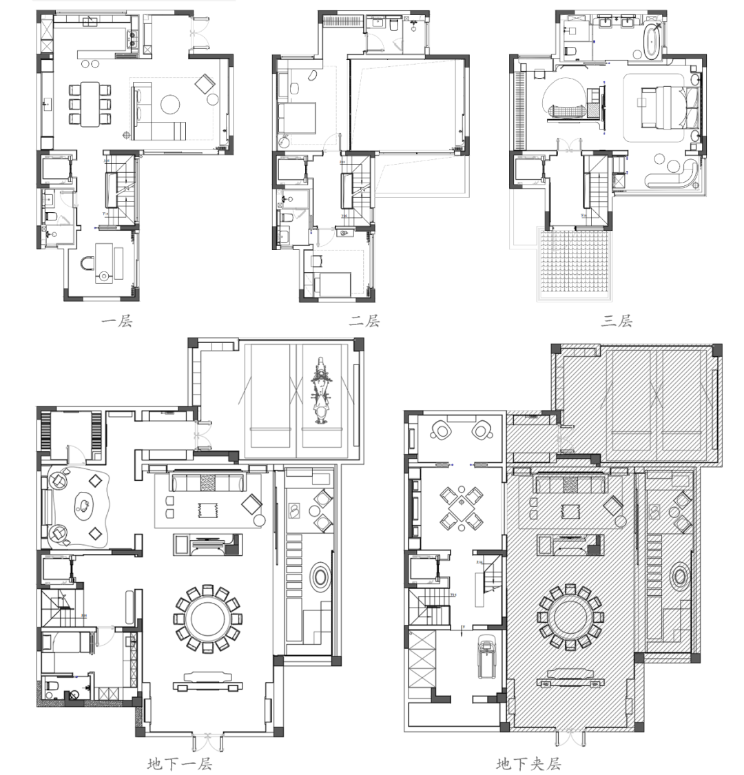 建筑面积约410㎡合院户型,地上三层+地下一层,室内空间将公共活动空间,与私人生活空间实现了明确划分,关注每位家庭成员的需求,也保证了每个家庭成员的交互性和独立性。