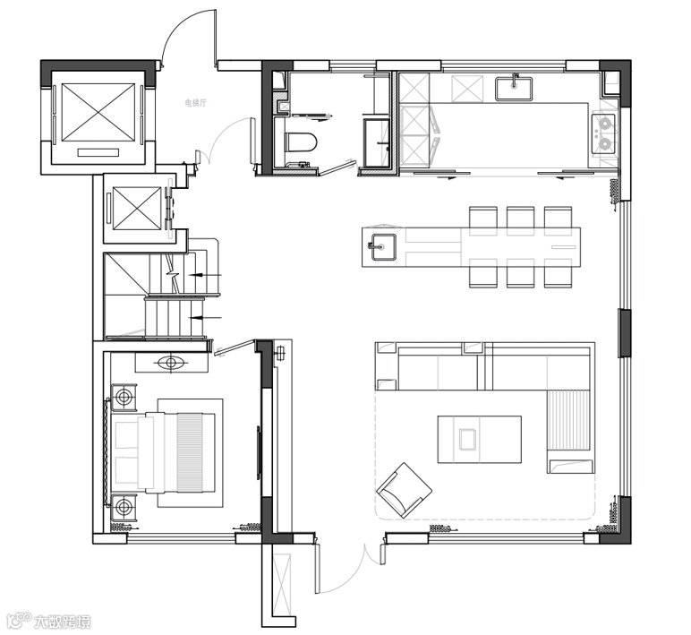 首先来看一层,设计师并非简单地拉大面宽,而是将面宽进深比控制在接近1:1。如此,一层获得了一个巨型方厅,开间约6.7米、进深约6.8米。270度观景客厅,LDK一体化,约6米局部挑高设计,配合大落地门窗,提高室内开阔尺度。