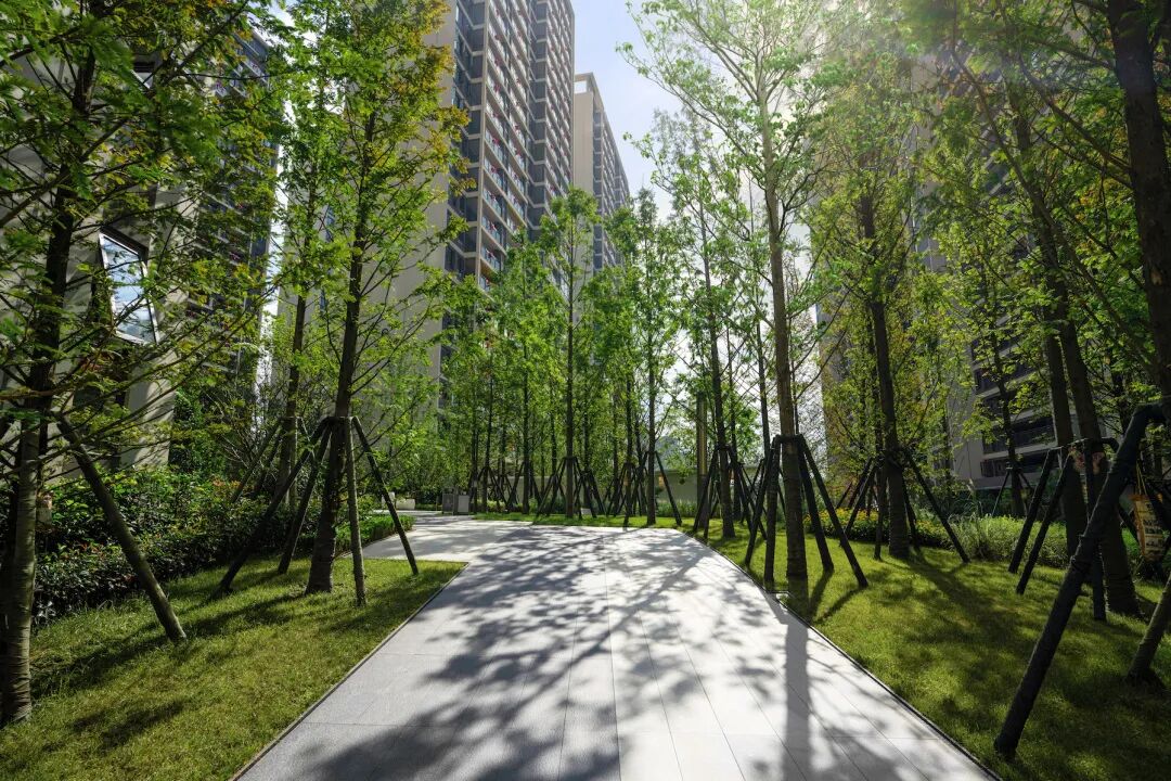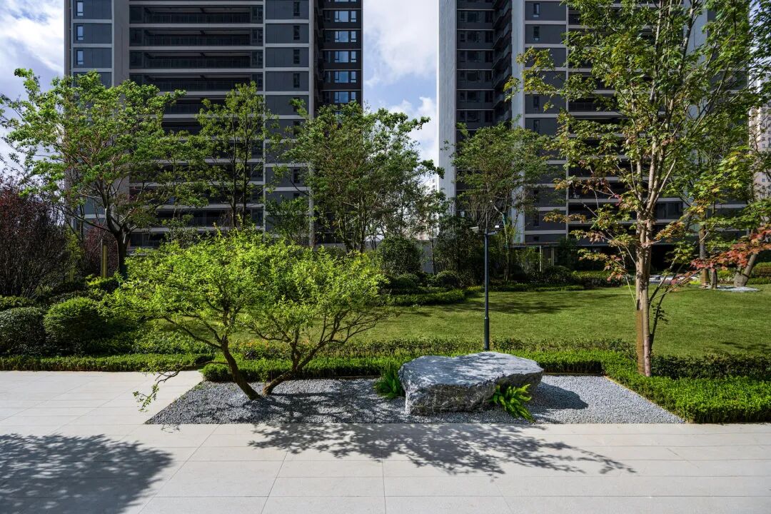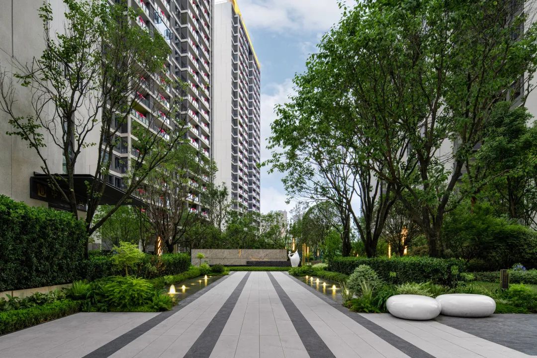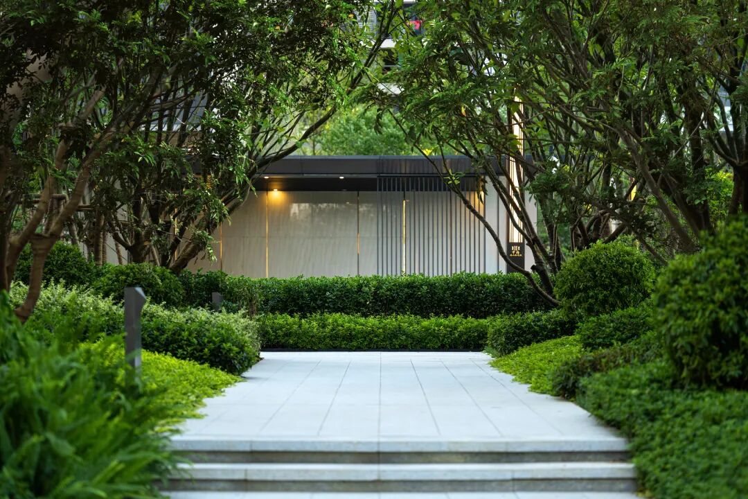 入户体验关系到归家的舒适感,设计运用三层种植手法,通过中乔木+大球体+地被的方式,营造精致和热烈的归家氛围,精致怡人的自然之景,让归家的每一步充满着尊崇与礼遇。