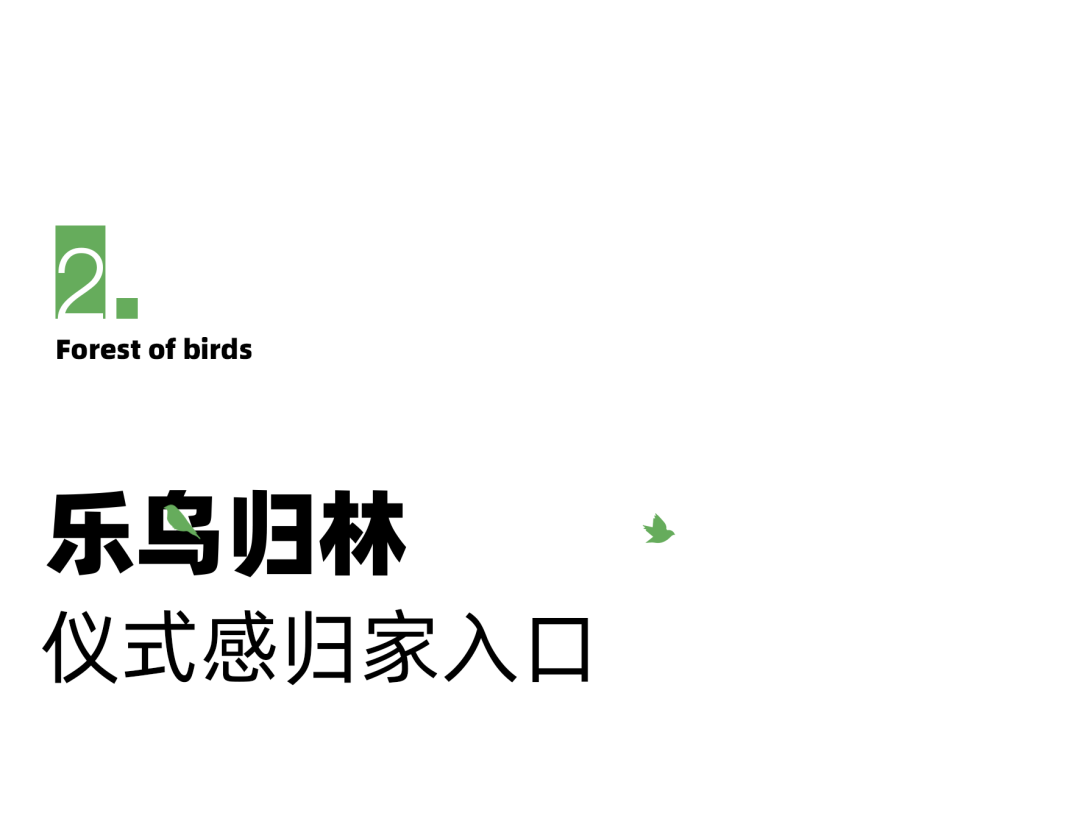 秋山之上,密林之中,乐鸟归林,由境入心,启幕生活。归家入口,以自然林意,打造尊崇的酒店式归家入口。迎宾之轴,礼序开阔,带来空间的品质感及有层次感的视觉递进 ;阵列植物及精致花境,拉近家与自然的距离,纵深开阔间,带来宾至如归的尊贵感受。