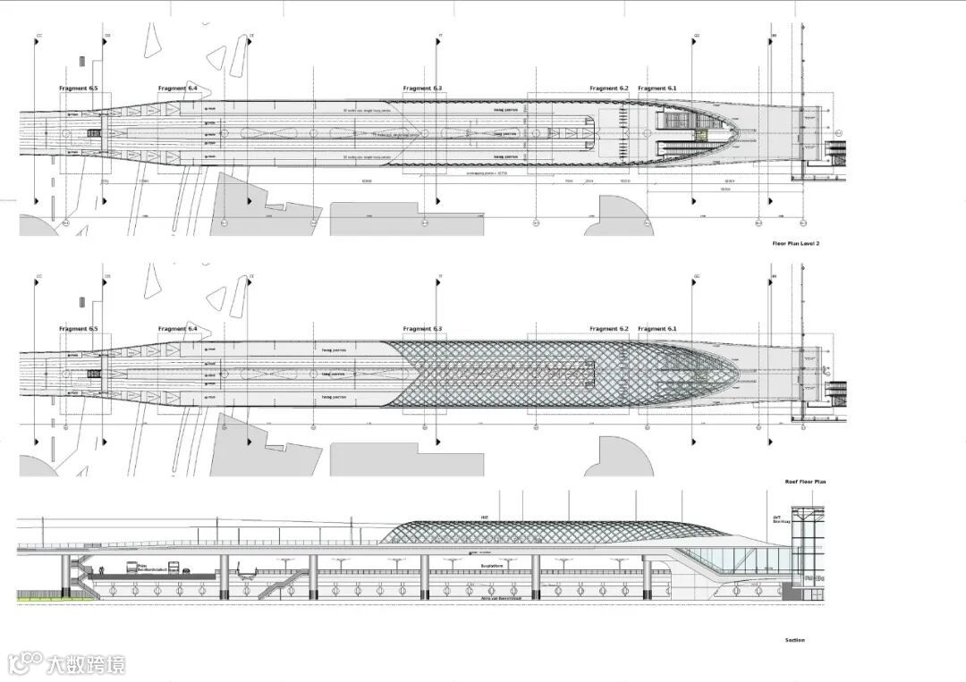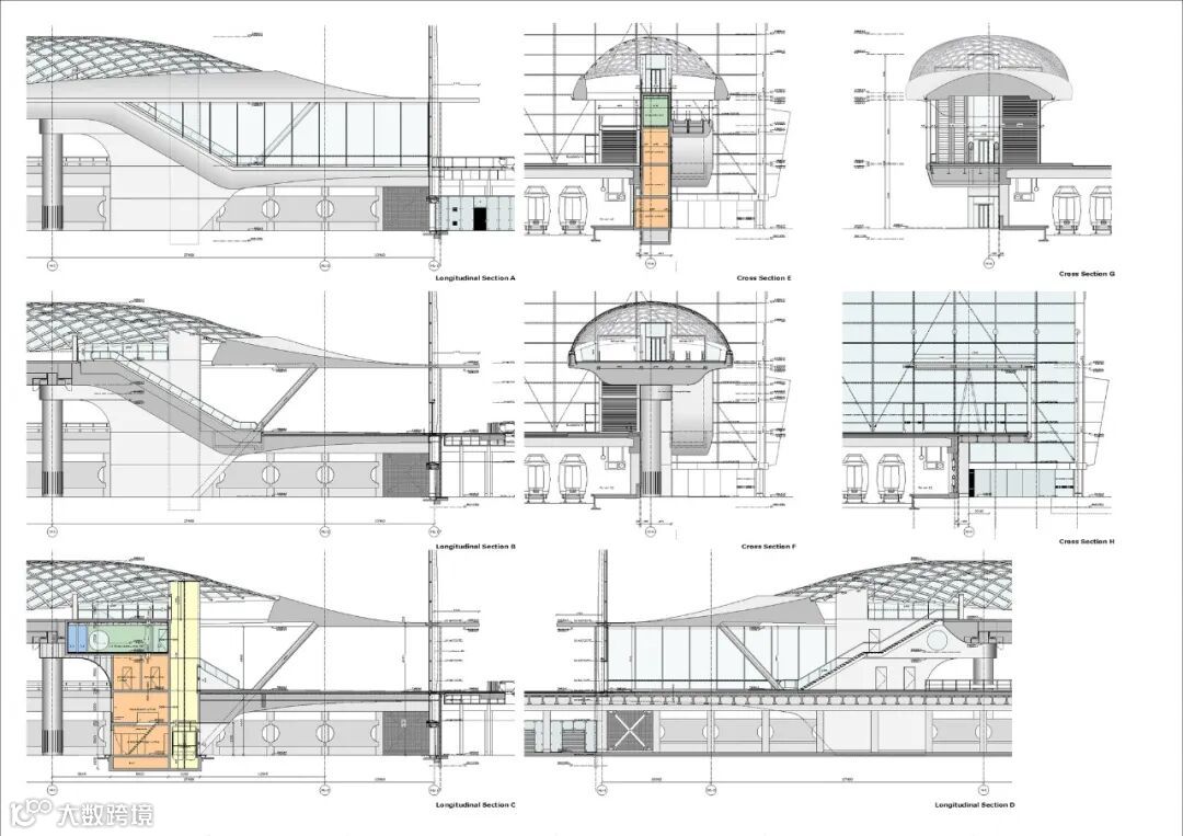 可识别性和舒适性。当它接近火车站时,光缆雨棚和高架桥将自己雕刻成一个尖锐的轮廓,并穿过玻璃入口外墙,进入主站厅。大厅内的这种延伸为两个车站之间的通道提供了可读性,并使寻路变得容易,因此以一种可识别的、舒适的方式引导乘客。在城市环境中,屋顶的透明和拱形网格作为一种诱人的姿态发挥作用。
