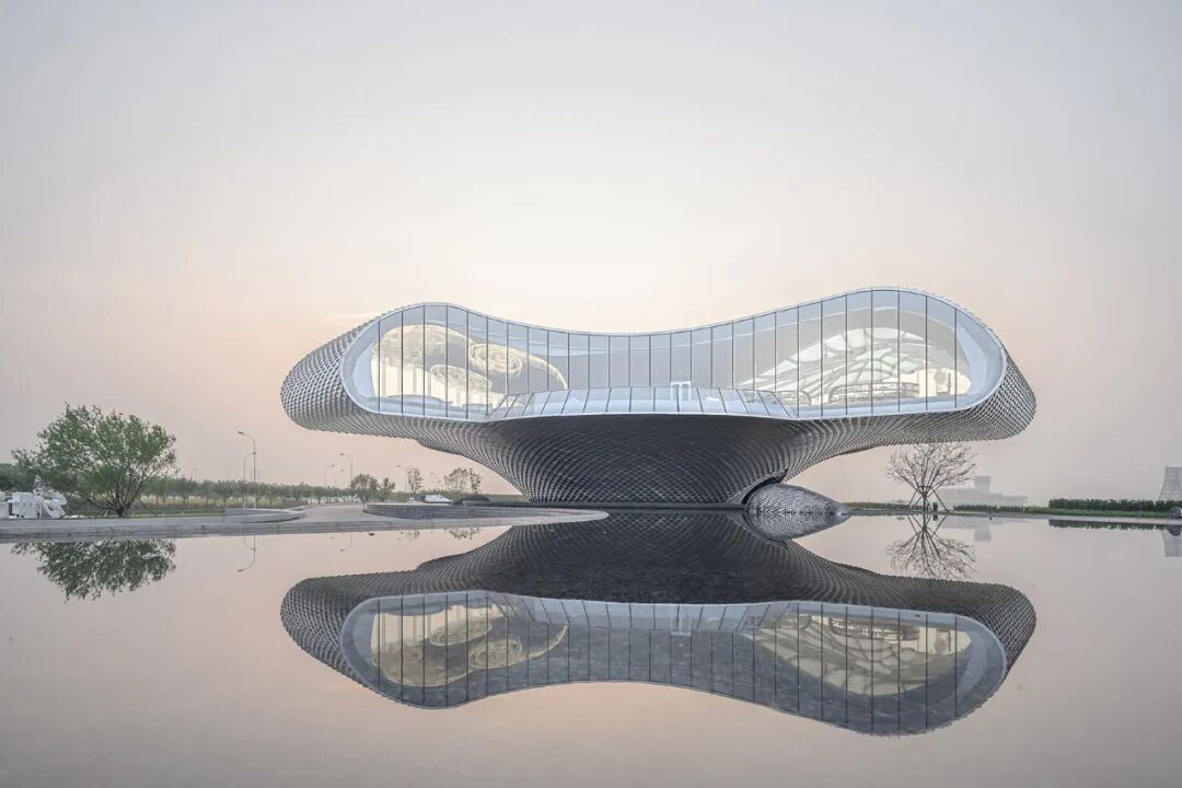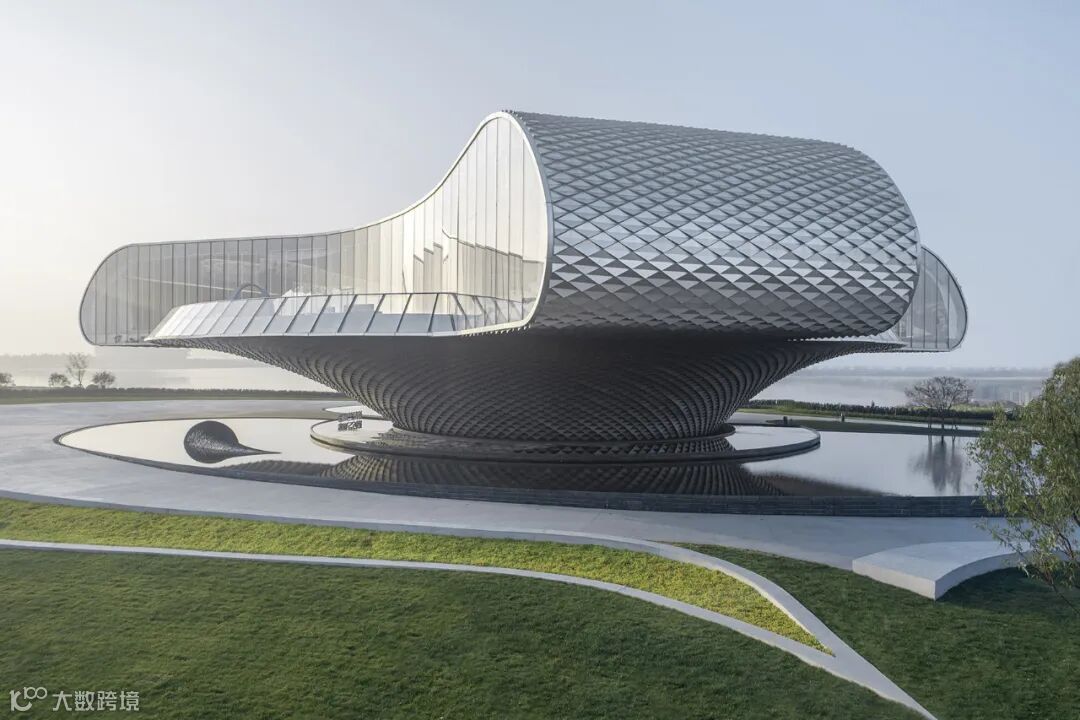 建筑的表皮运用一体化参数化设计,鱼鳞片状的铝板微妙的变化排布,使外立面从各个角度反射不同时刻的阳光,建筑周围的水池对光线的漫反射,再次投射到鳞片状的立面上,使建筑呈现出丰富的光影变化。