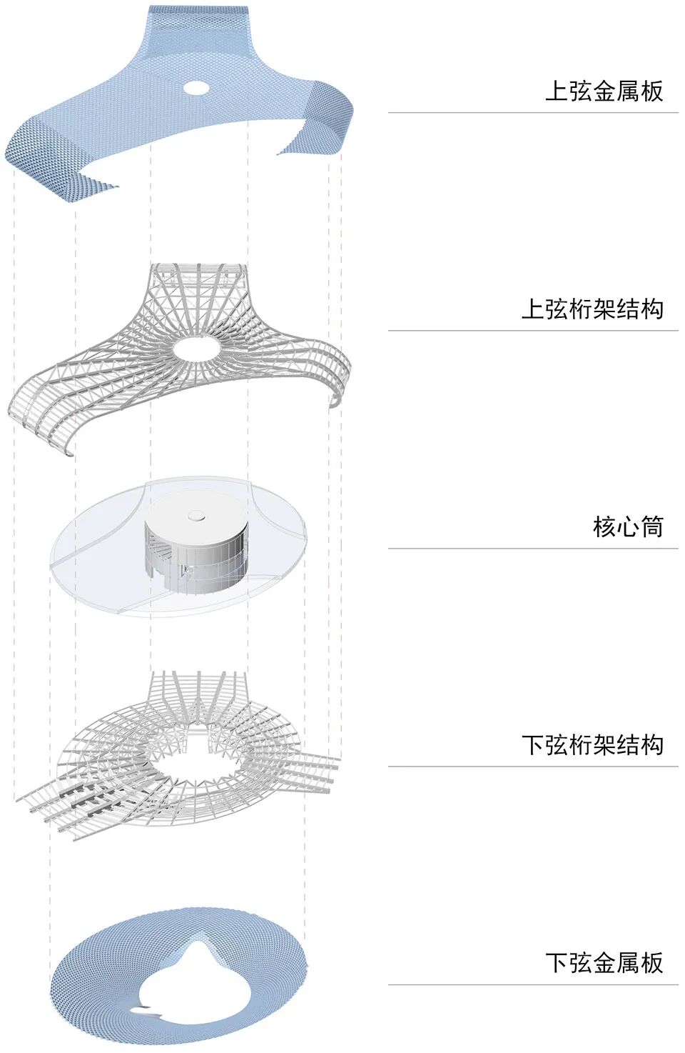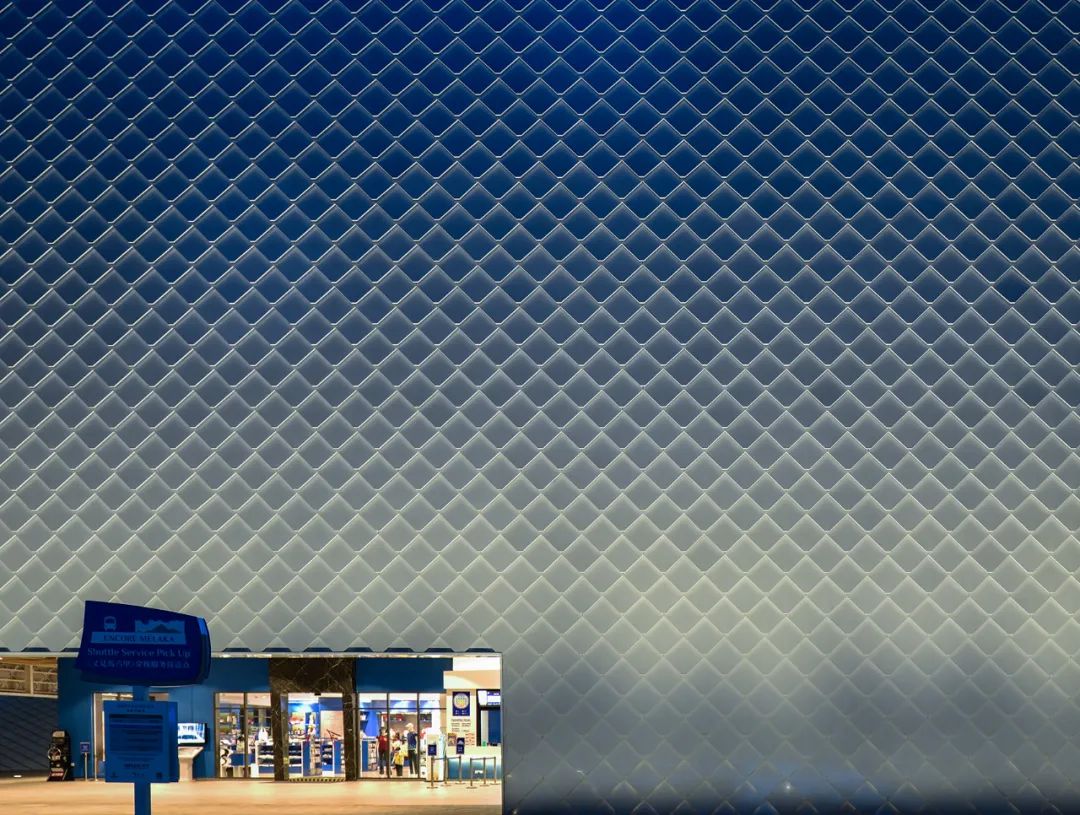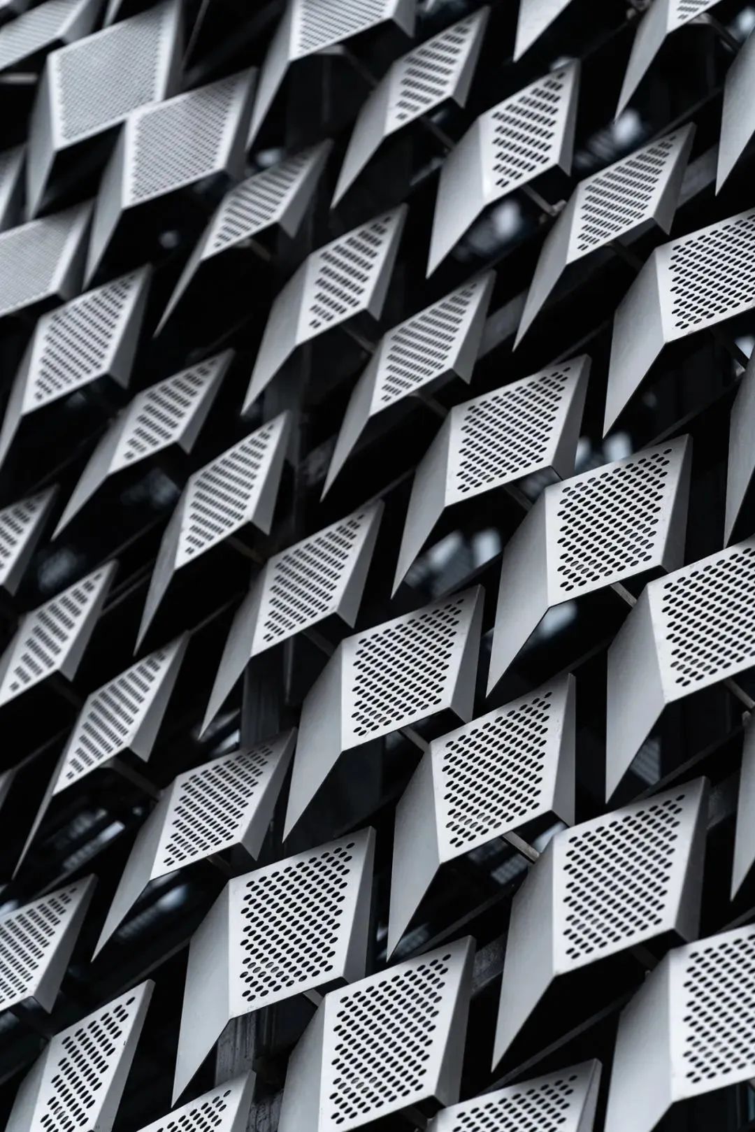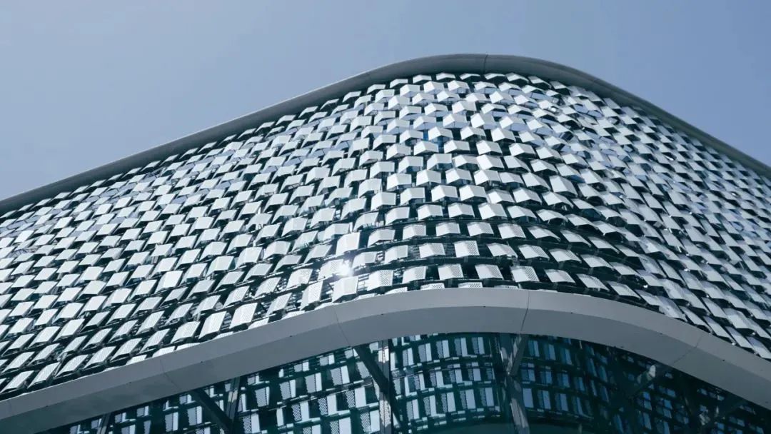 鳞片幕墙由8527片成角度的穿孔金属板组成:不同角度组合的几何状鳞片铝单板,外立面铝单板由6种不同规格、不同角度的铝单板鳞片与11种不同角度的304不锈钢连接件一一结合。