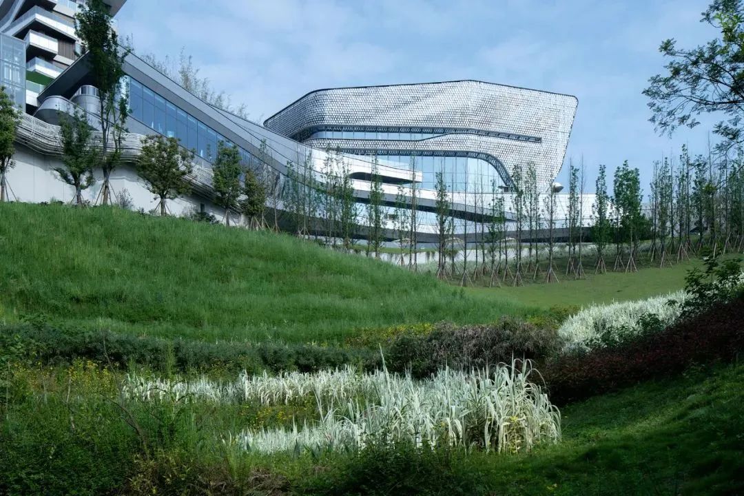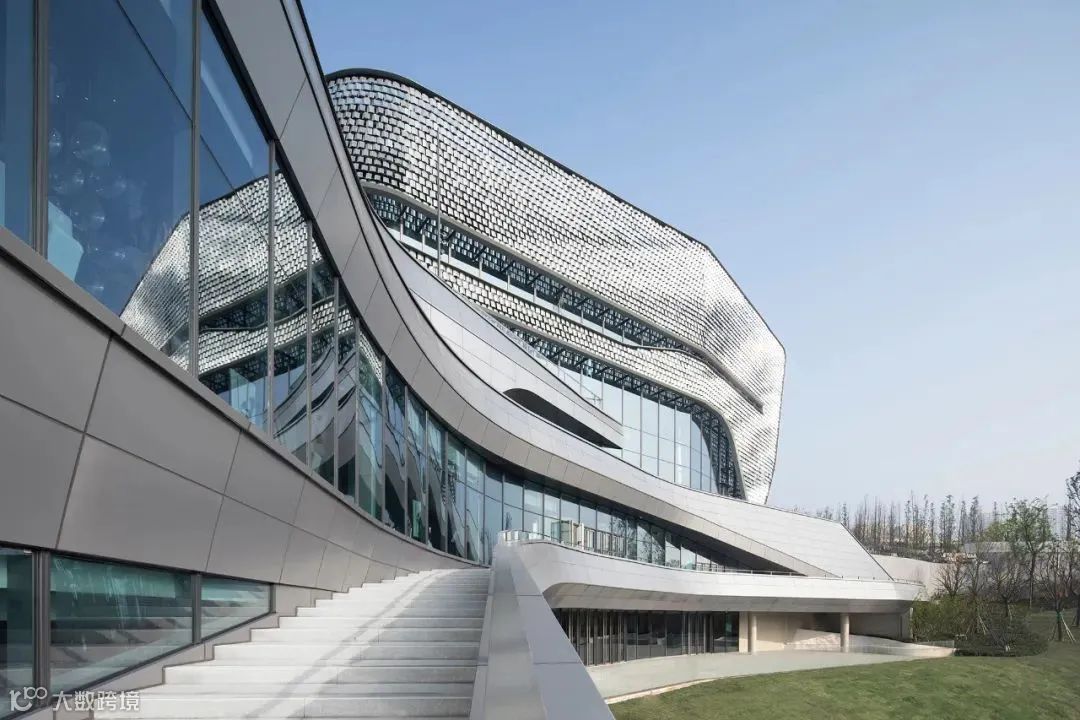 鱼鳞片状的铝板运用BIM技术,一万三千多片不同规格的铝板在外立面做各种转变贴合,实现了富有韵律变化的双向螺旋而上的肌理感。