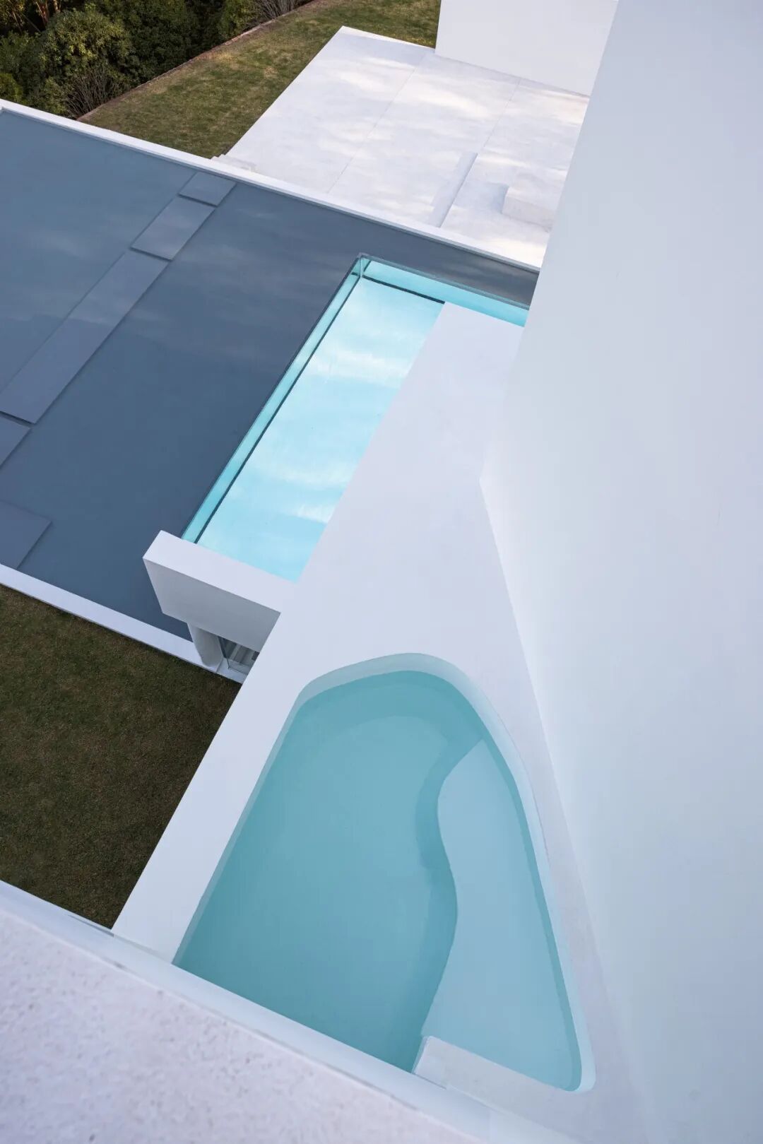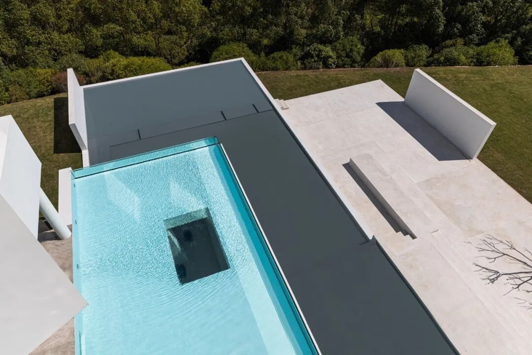 泳池作为连接内与外的媒介,通过打通的体块让光线照射进地下空间,空间的共生关系进一步被强调。
