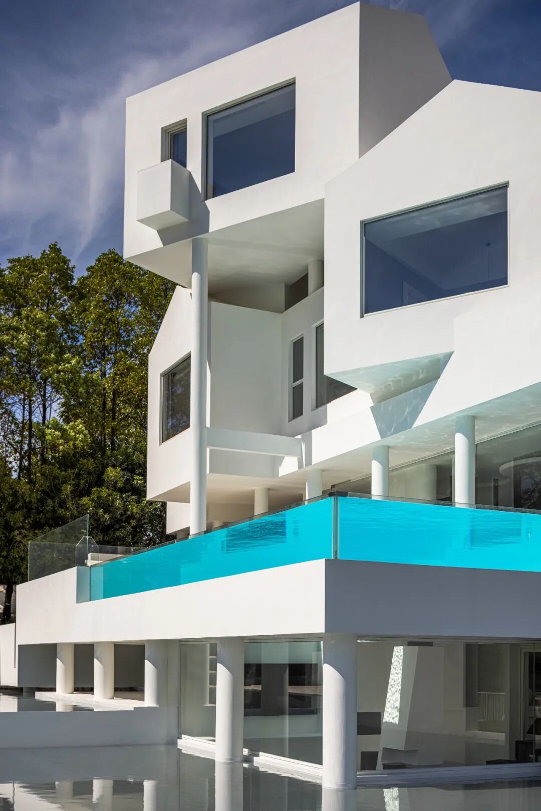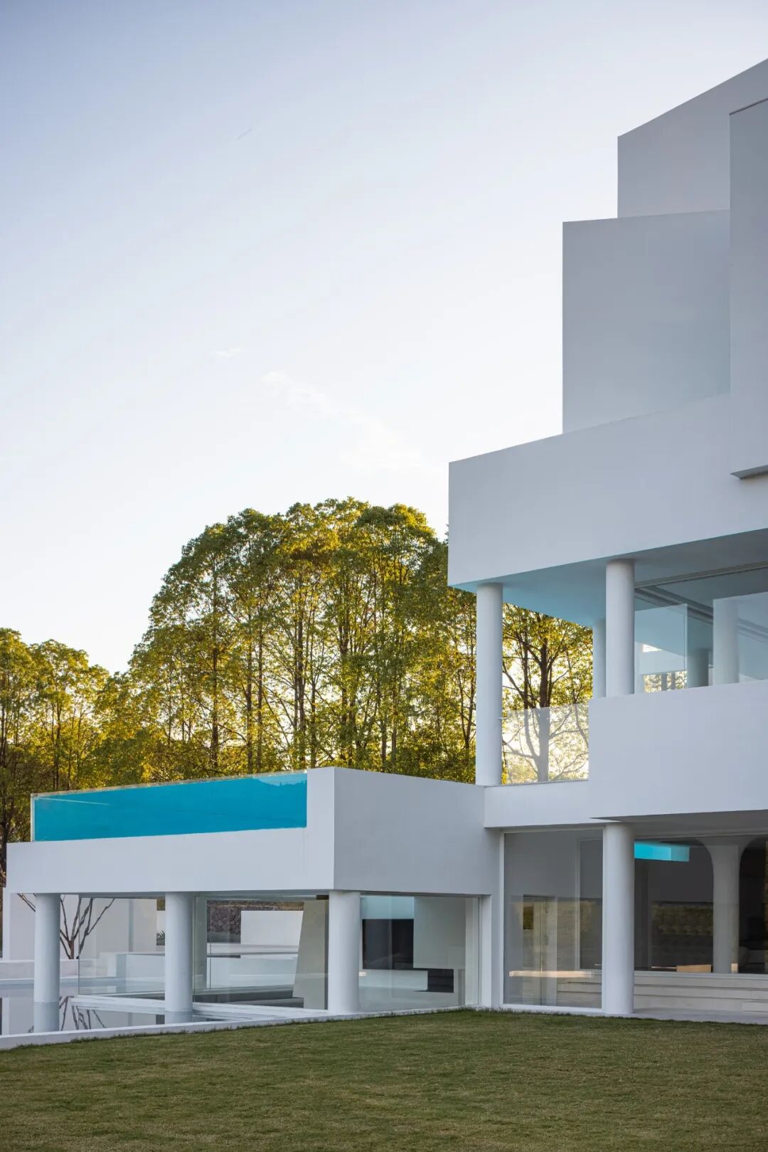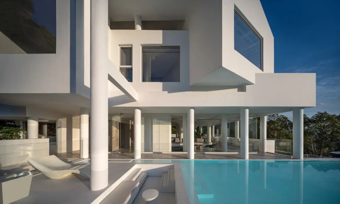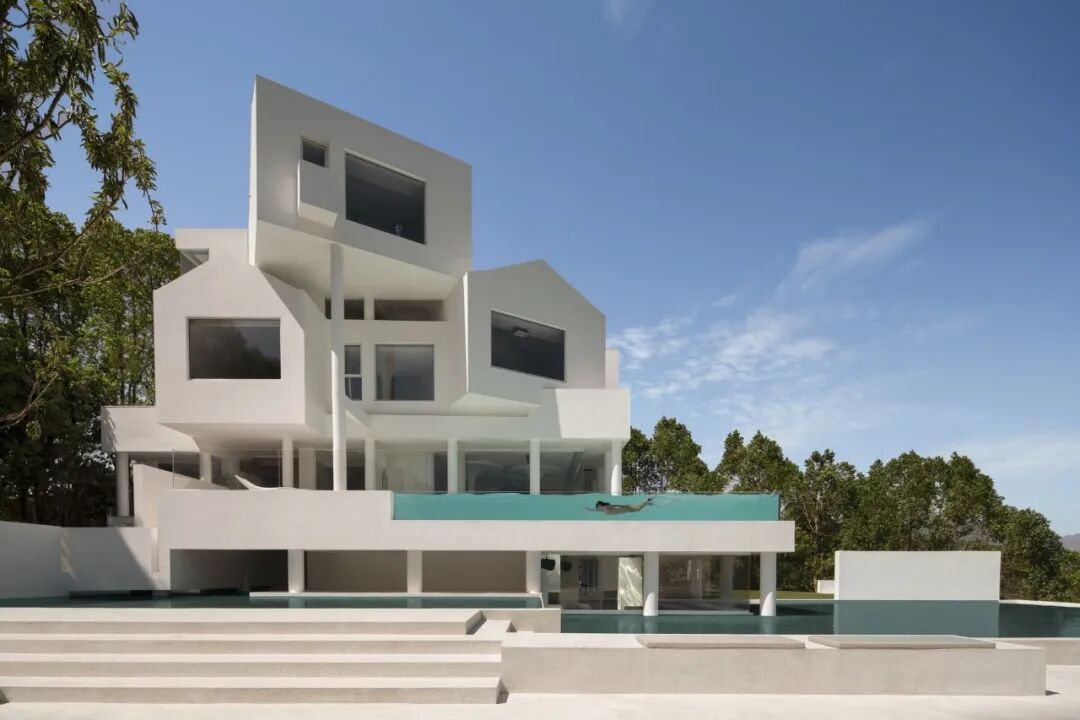 白色不止是一种颜色,更是一种深入人心的感受,无边泳池与天空的蓝形成了相互对话,构成了水天一色的景象,如同空间中的一片精神湖泊。