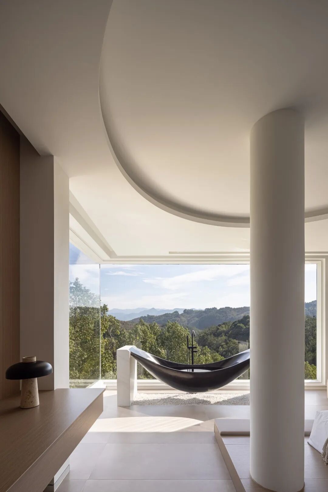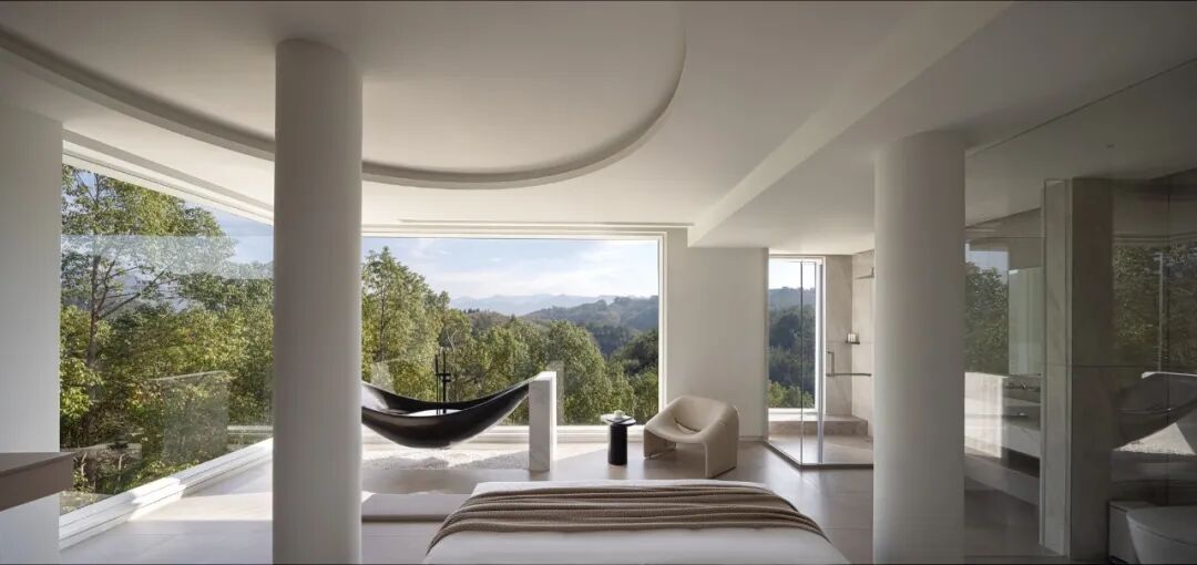 90°的落地开窗设计让周围群山尽收眼底,沉浸于摇篮形状的浴缸内,依山而眠。