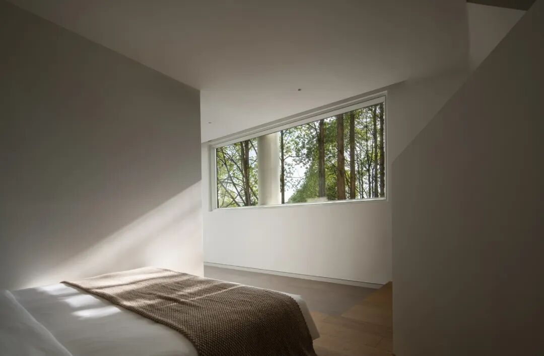 纵观酒店被山林所包围得天独厚的地理环境,设计师在建筑上用白色涂料包裹,像是一个米白色树窝,在林间描绘出明暗的边界,打造出一片屹立于山间的别样风景。