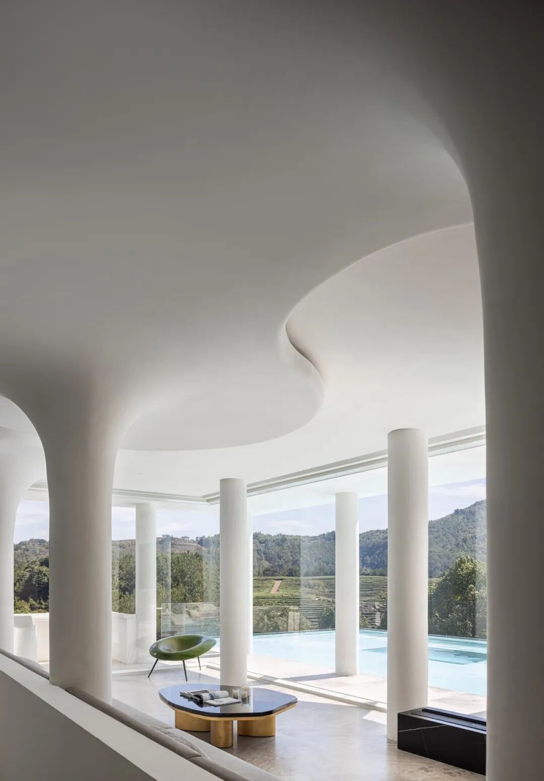 The wraparound rest area is surrounded by columns connected to the top, and the curved structure wraps the top surface of the shape, as if entering a forest. Floor-to-ceiling glass offers views of the lush landscape outside, blurring the boundary between the interior and the city.