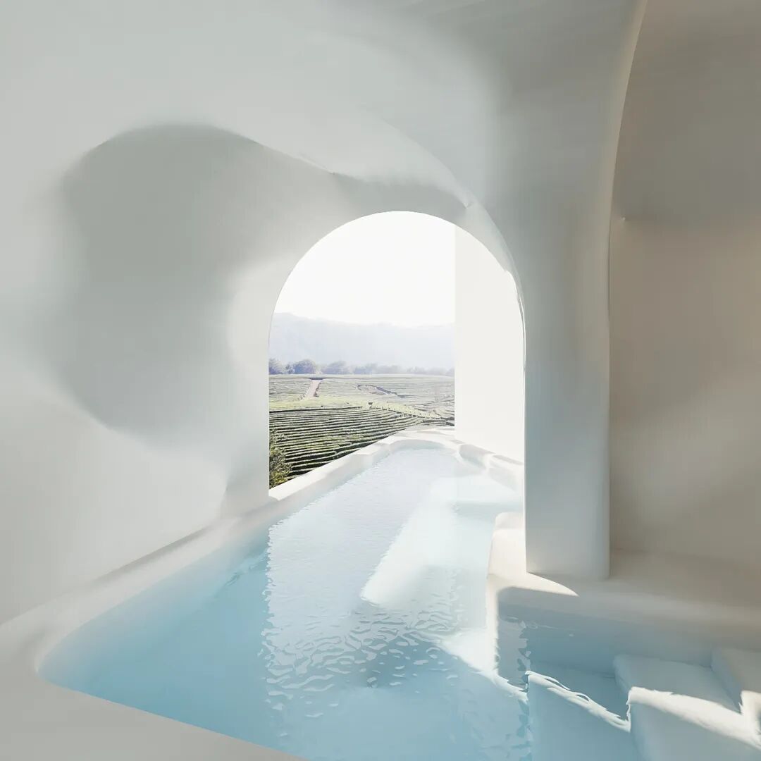 客房中加入溶洞般的泡池,可以望向远处的茶园风景,深入体验山林间的乐趣。