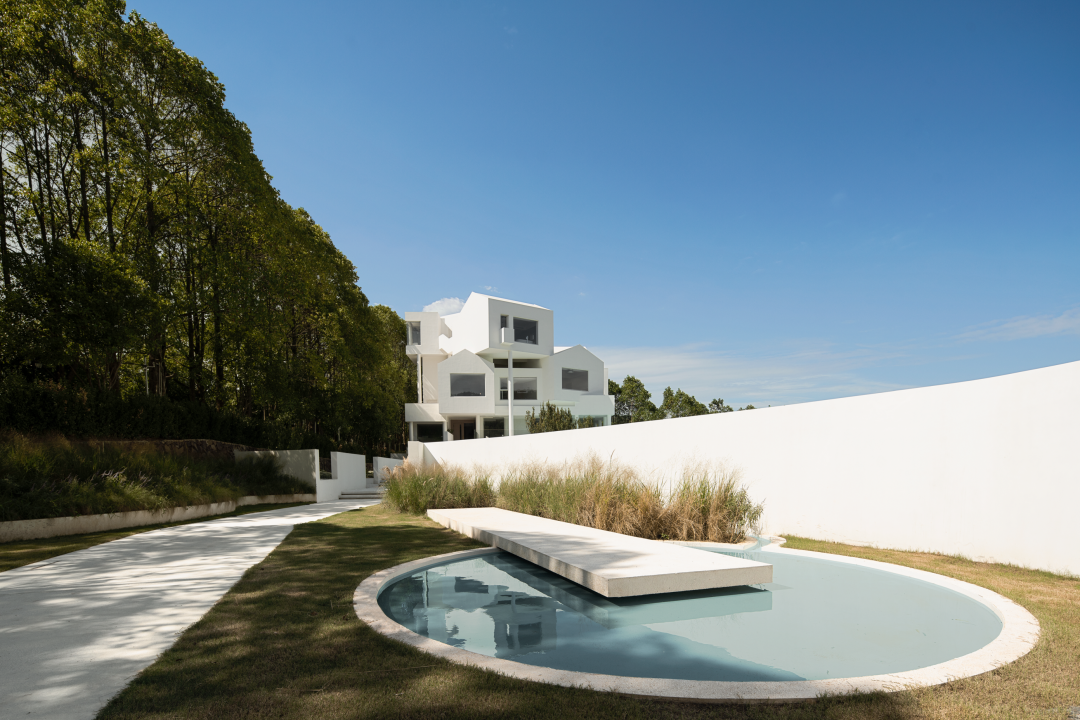 从远处望去,酒店隐隐地透过树林被看见,与城市的熙攘隔绝,像是一片隐藏的白色树窝。