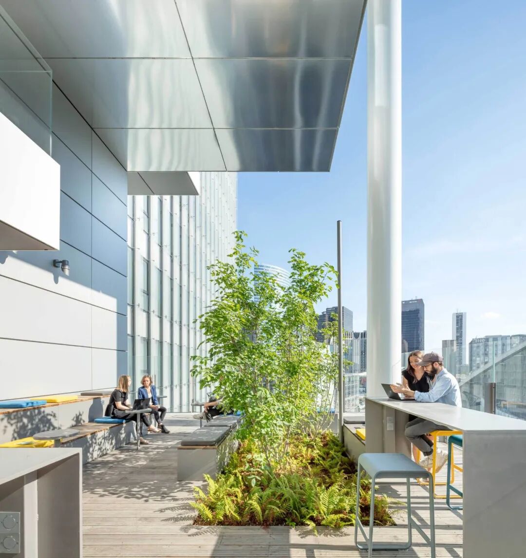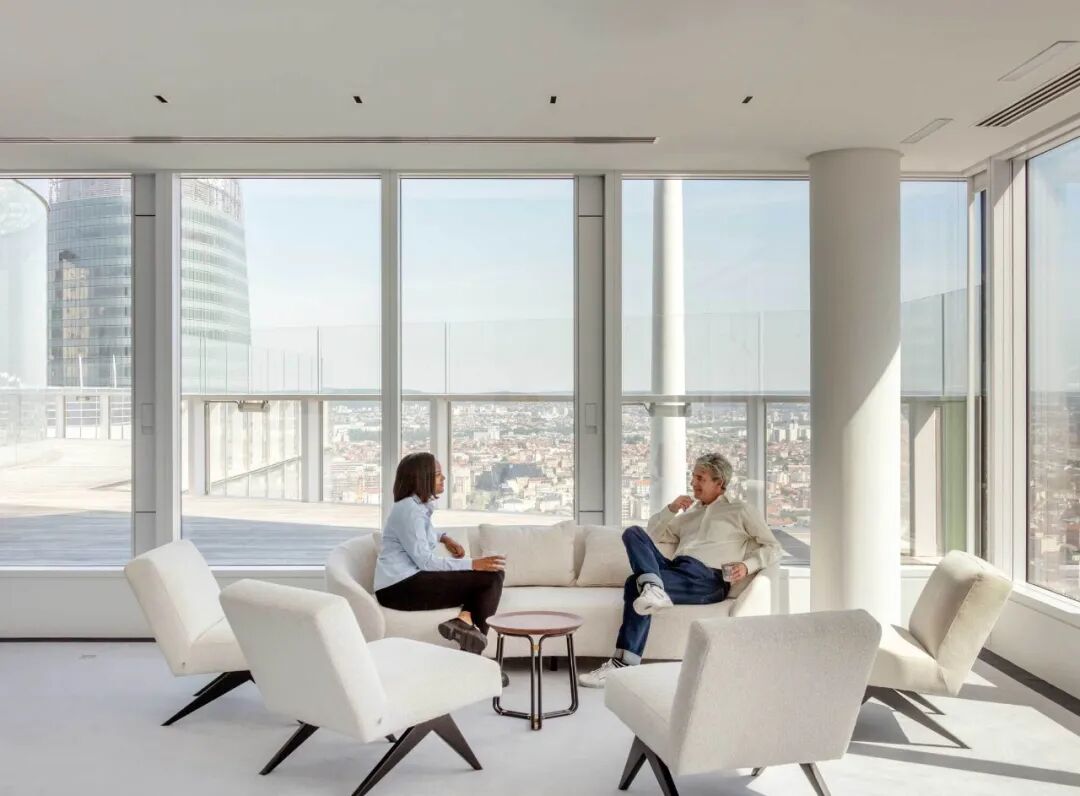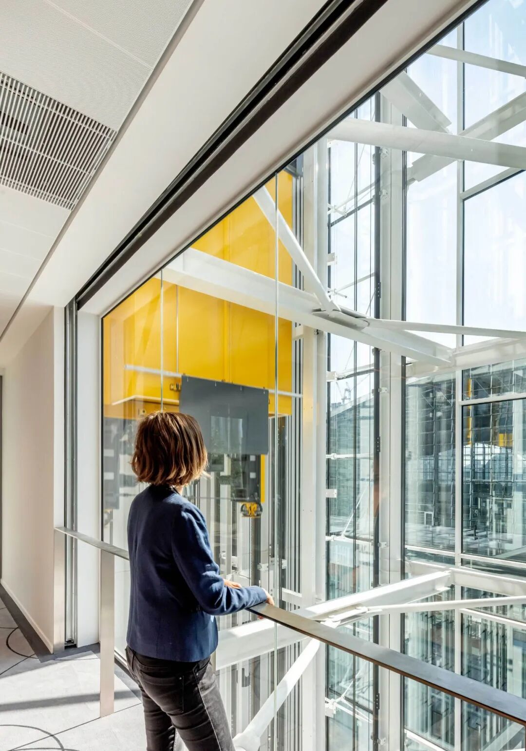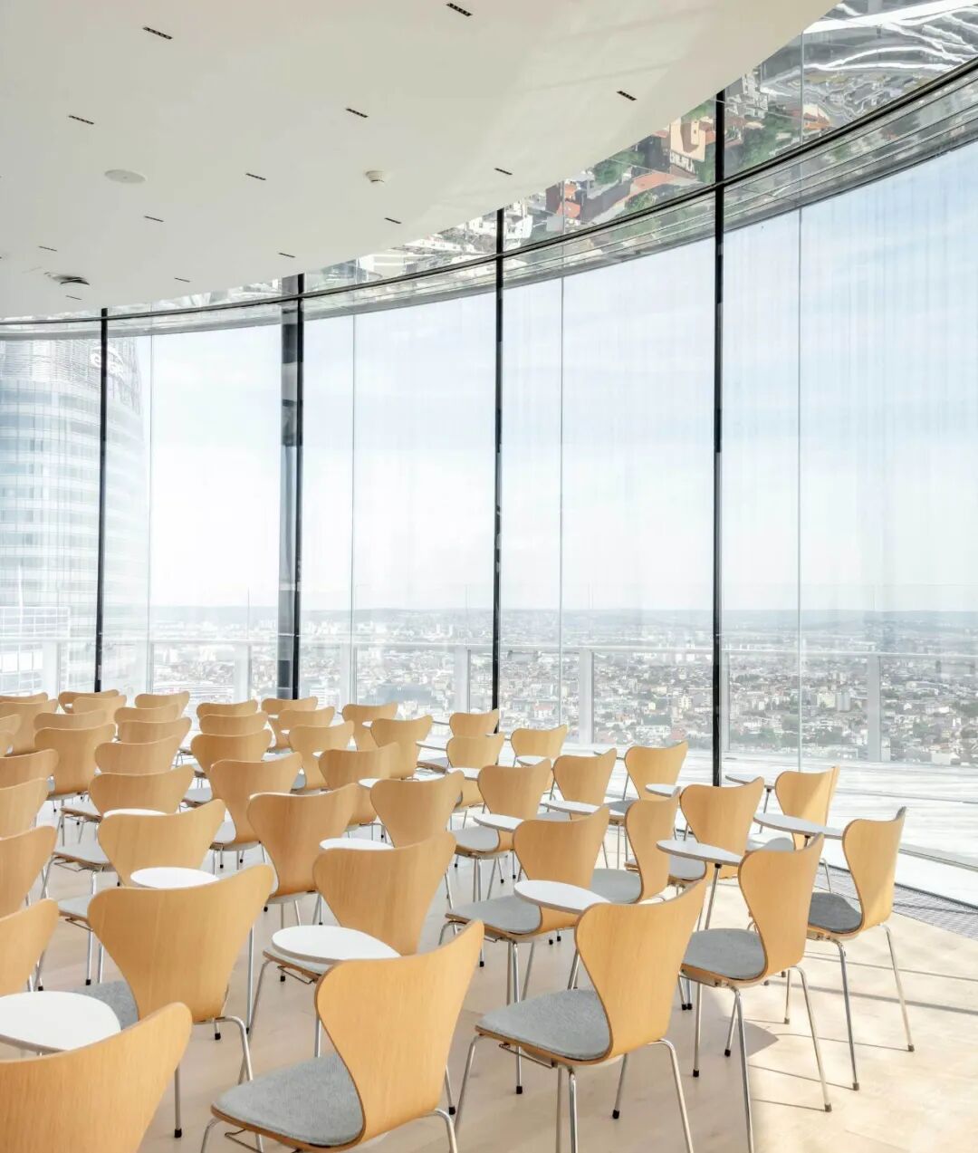 Trinity is La Défense's first tower to develop an off-center core, a "heart of life" with exterior glass-walled elevators in the façade; allowing for visibility of activity in the building from outside and for users to take advantage of the sweeping landscape views of La Défense. The large, vegetated terraces and the community spaces are located near the elevator lobbies working as improvised meeting points. A series of other informal social areas are added on different floors. At the top of the tower, six floors merge into three duplexes with connecting convenience stairs. The 25th floor has a panoramic terrace, a large meeting room, and a wellness center, offering various shared amenities with a view.