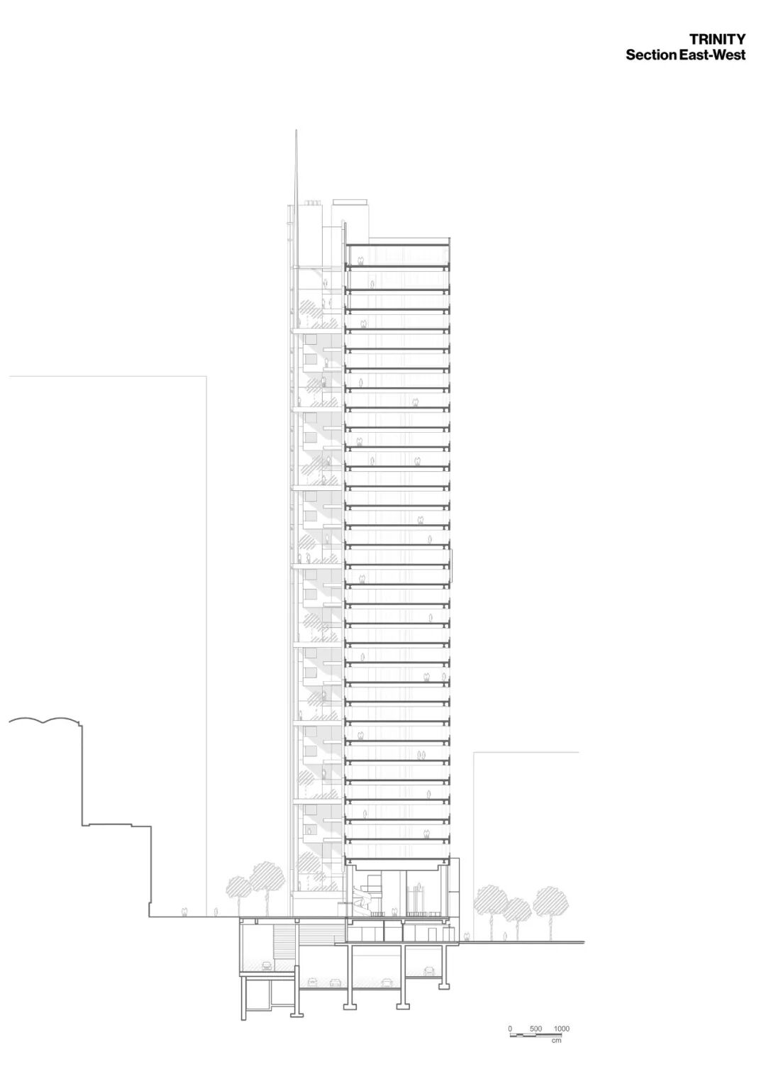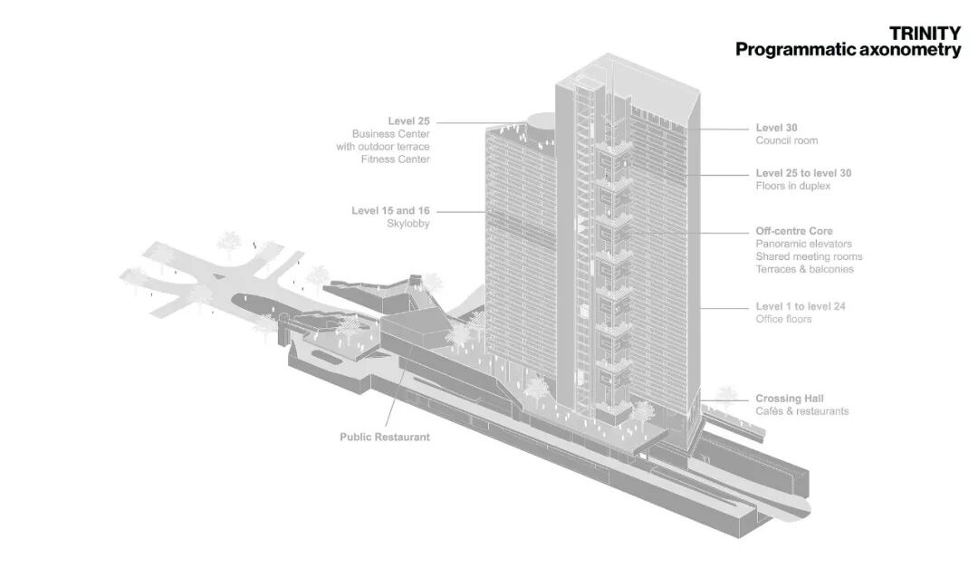 The tower has a total of 1,500 m² of outdoor spaces (8 terraces, 12 loggias, and 23 balconies). The project is also a model for sustainability. Beyond planted terraces on every floor, Trinity Tower introduced bioclimatic glass façades and operable windows in each second façade grid to create interaction between inside and outside. It prioritized the use of local and low-carbon materials including low-carbon concrete, which emits 30% less carbon than conventional concrete. Additional sustainability efforts include the reuse of energy and an incentive for different means of transport, including a large 200-space bike room.