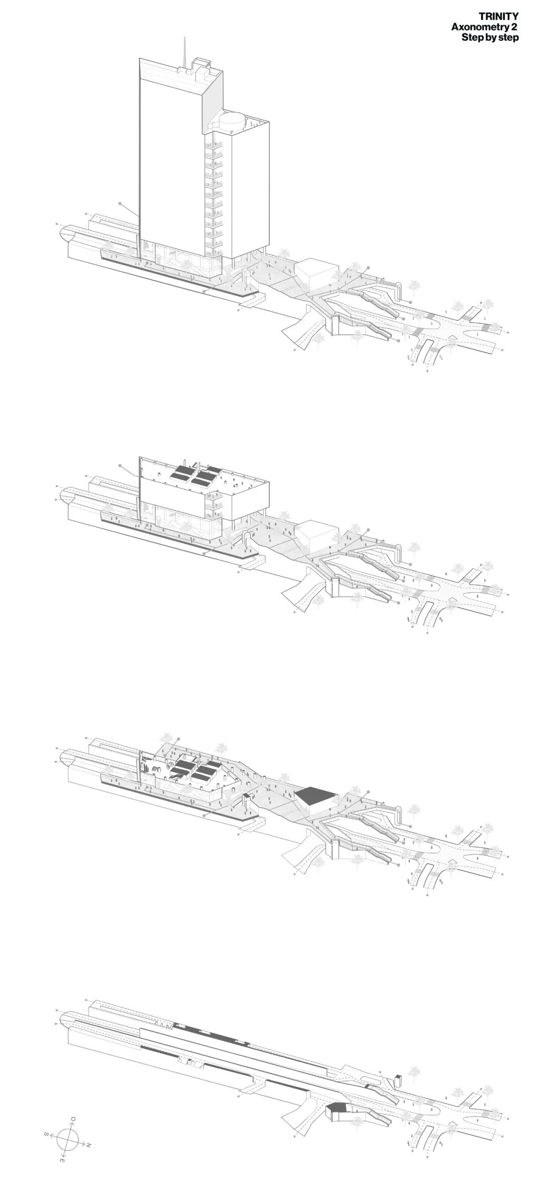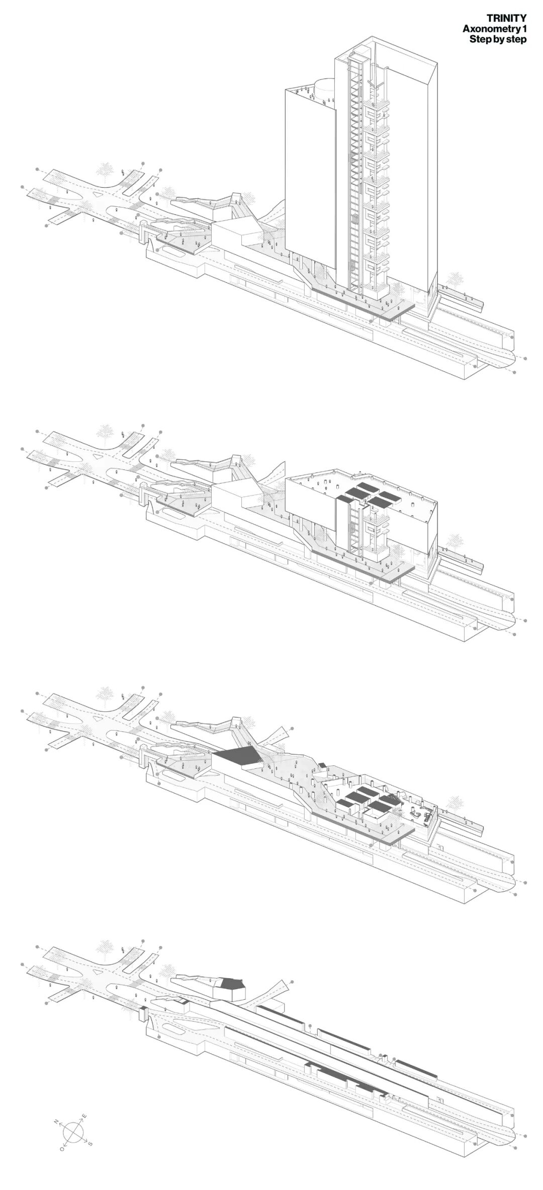 三一处于建筑和城市化的交叉点。它的具体解决方案有助于将拉德芳斯的前单一功能的商业中心转变为一个网状的城区。3,500平方米的景观和公共空间将在其之后创建,连接Cnit和Coupole-Régnault社区并提供公共服务。