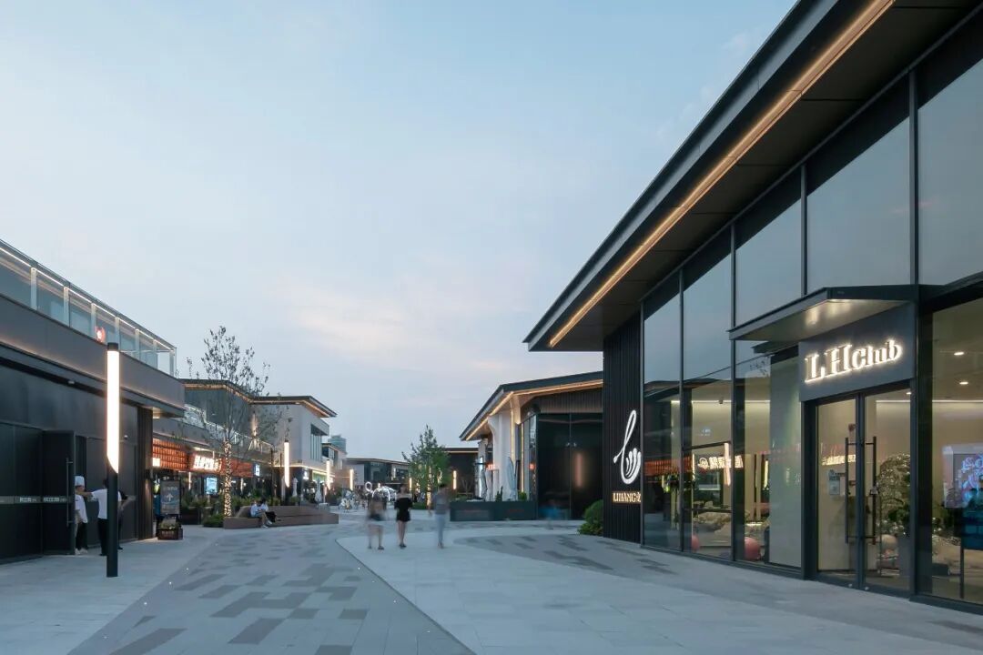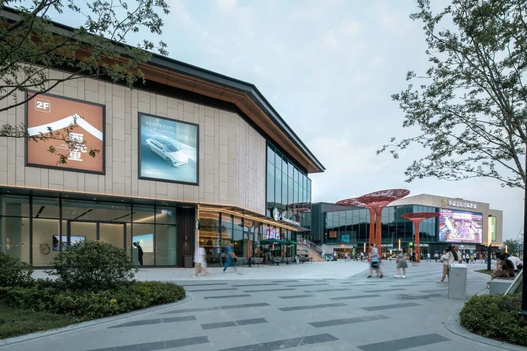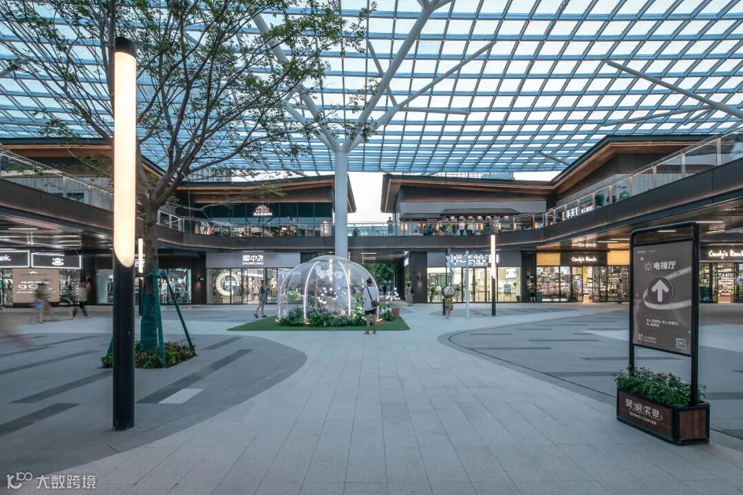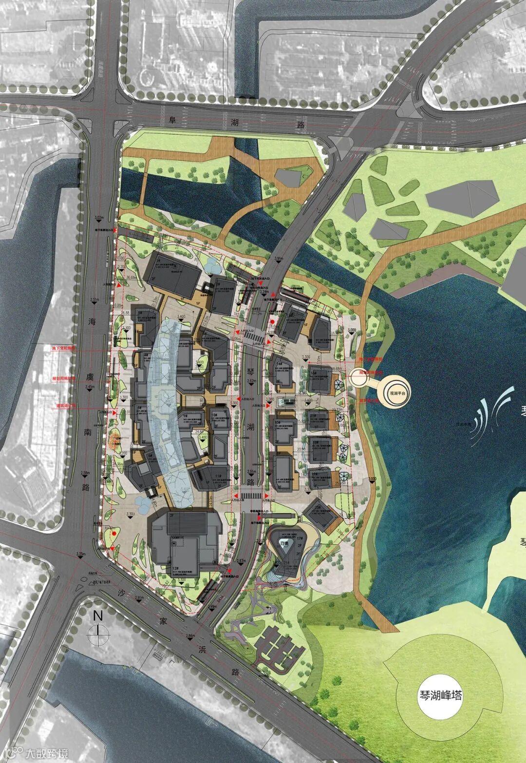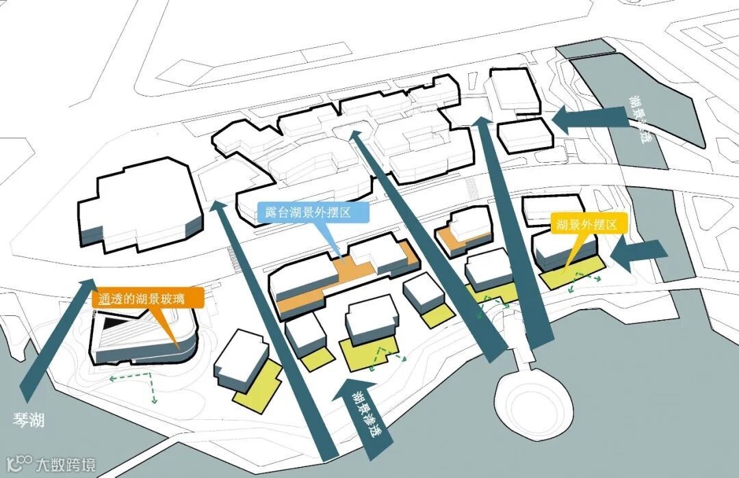 项目定位为体验型主题商业街区,通过环形主动线串联两个地块,结合湖山之轴与商业广场设置视线通廊,链接各个广场与院落间的商业活动,友好互动滨湖景观资源,激发商业活力。