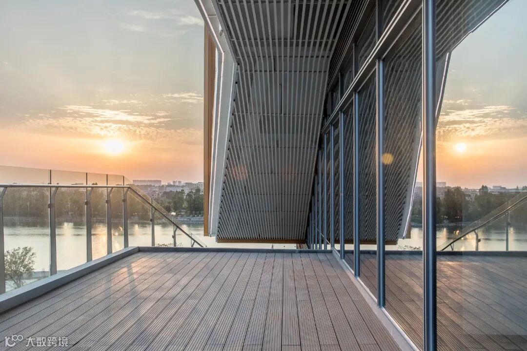 项目的西面是东江的支流,江面宽阔,视野良好。但岭南地区午后的西晒又是让人难熬的时段。在本案的设计中,为了让使用者既能享受西面最好的景观,又能不受日晒之苦,采取了主、被动遮阳的复合措施。