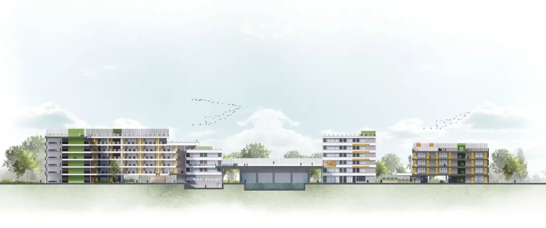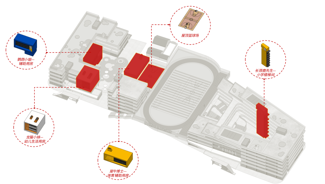 运动场与教学及行政楼间通过阶梯连接,向下聚合室内游泳池、篮球场、舞蹈室等多种丰富有趣的底层娱乐空间。