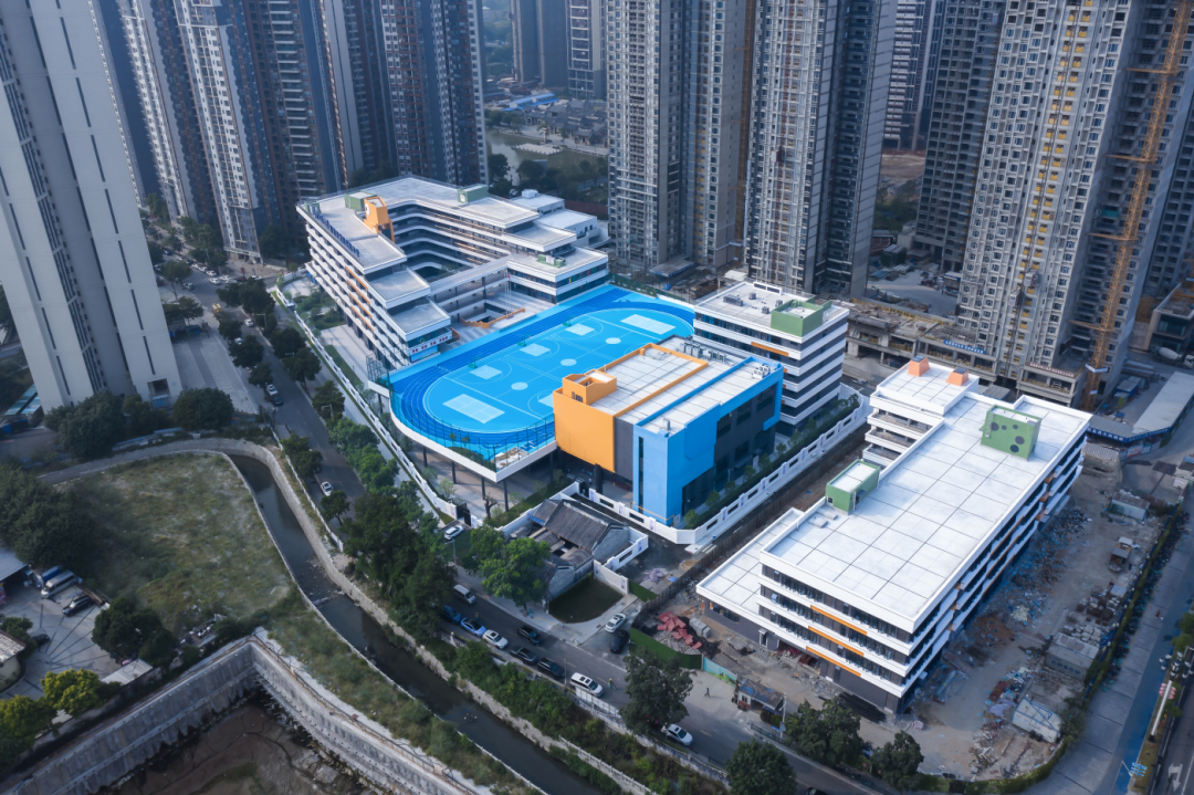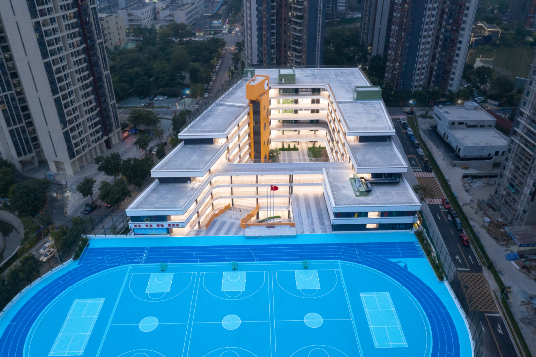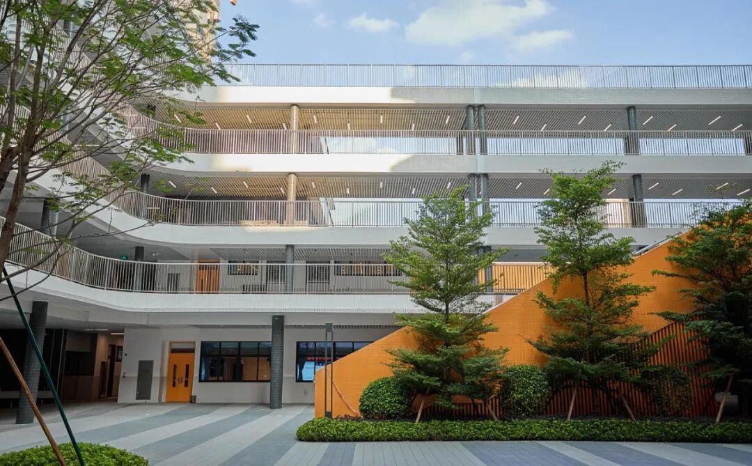 今年9月,广州万科文冲华师附小已落成开学,未来将有2000多名孩子于此开启童年生活。为了学生能在局促场地中拥有多元且充裕的活动空间,项目以竖向突围,设计操场向上整体抬高8米,形成架空运动操场。