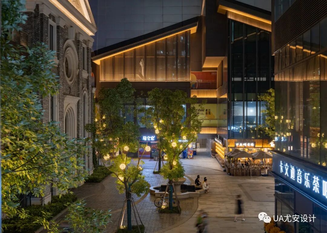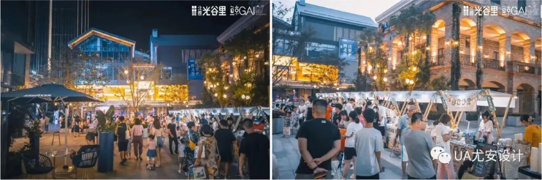 街区内形态各异的风情建筑与现代风格相融合,不仅打造出一种游街串巷的空间体验感,赋予光谷更高的辨识度;同时,弱化了商业的刻板属性,形成一个个独立驻留情感力的多元空间,营造出景区般的愉悦氛围。新与旧、传统与现代在此融合,塑造了穿越时空的沉浸式场景体验。