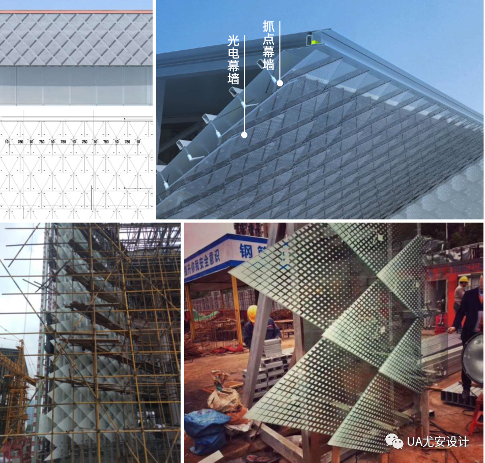 定制鳞片的模块化叠拼 在展示中心的主视觉幕墙设计中,设计将光电玻璃统一进行菱形单元模块化的叠拼设计,形成鳞片状点支玻璃幕墙,增加多层次的空间效果。同时,现场测试鳞片光电玻璃亮灯效果,现场指导安装角度,精细化控制落成效果。纯鳞片玻璃构成的一层轻盈的水晶盔甲,在灯光的巧妙映衬下显得格外晶莹剔透。